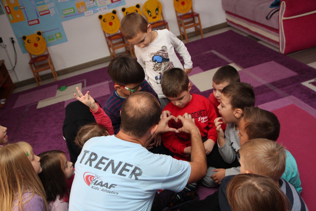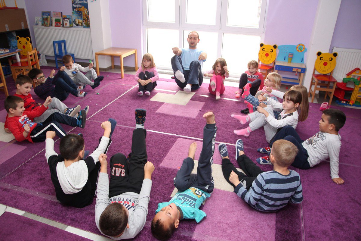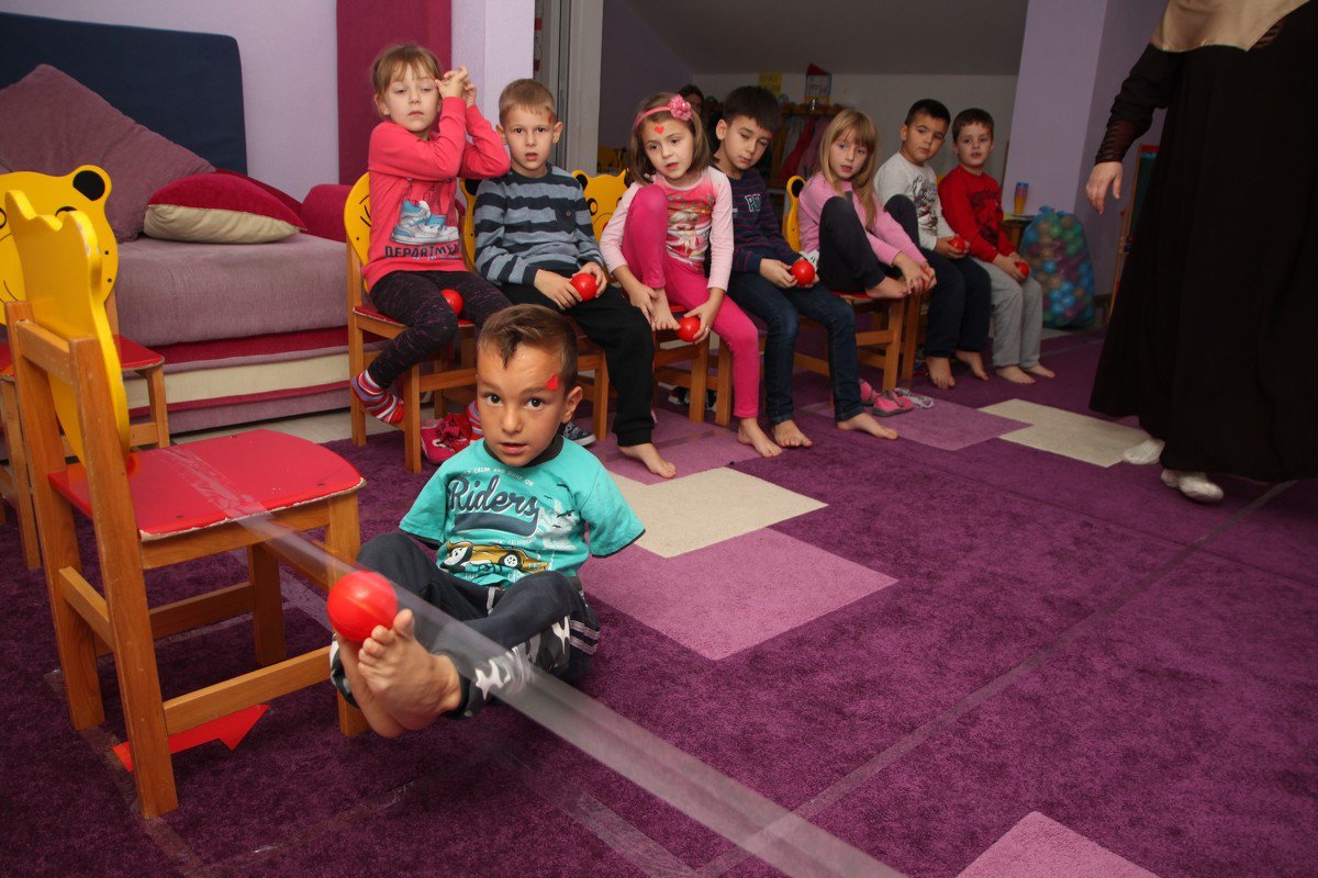 U vrijeme naše posjete igrali su igru lopticama u dvije grupe, i zadatak je bio da svako iz grupe što brže može lopticu nogama zalijepi za ljepljivu traku razvučenu između dvije stolice, grupa koja završi prva pobjeđuje, a nagradu u vidu pjesmice dobijaju svi. U drugoj igri cilj je bio što prije plastične čaše u ustima prebaciti s jednog mjesta na drugo. Poslije su svi skupa crtali, slagali lego kockice i igrali se. U grupi s Ismailom bile su djevojčice Asja, Farah i Aida.