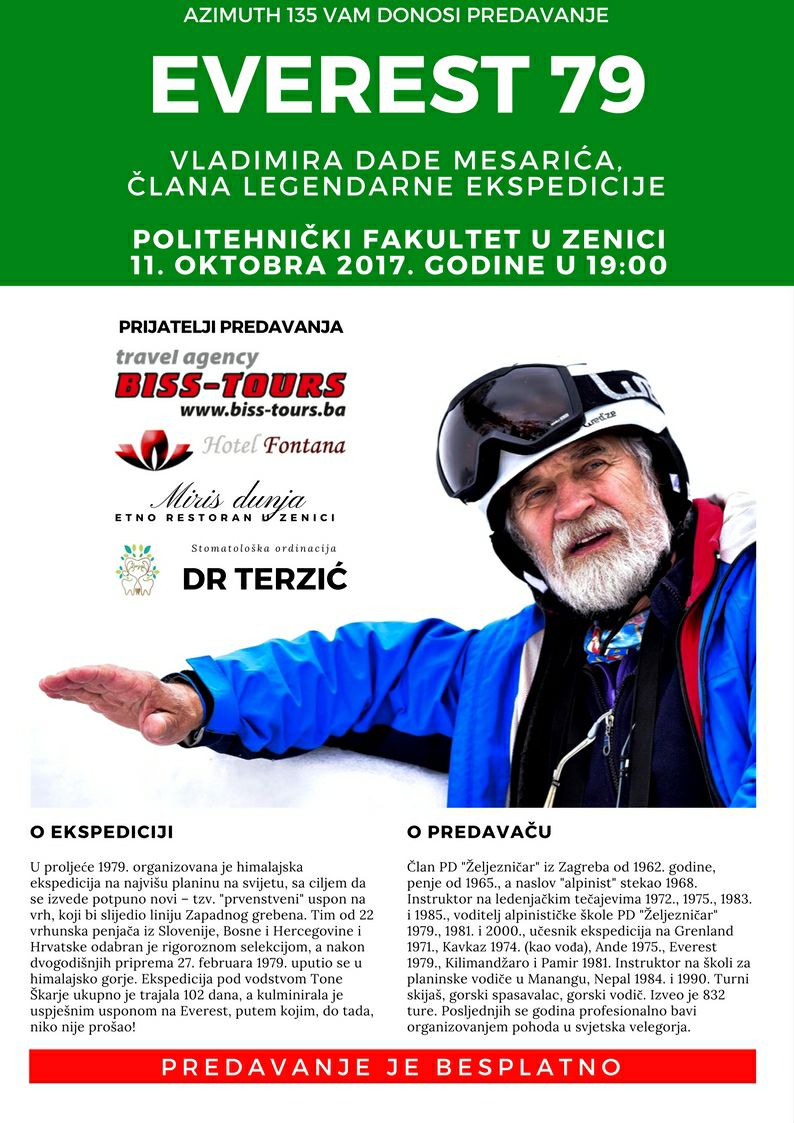 U amfiteatru Politehničkog fakulteta u Zenici okupilo se 70 ljubitelja prirode, planinara i osoba željnih znanja, da čuju predavanje jednog od članova najuspješnije ekspedicije ovih prostora – Everest 79. Na početku se prisutnima obratio i predsjednik Planinarskog saveza Bosne i Hercegovine, Zehrudin Isaković.