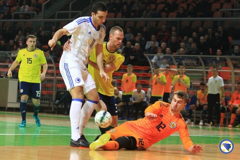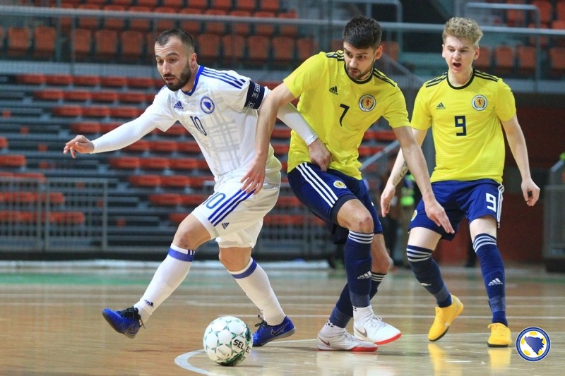 Reprezentacija Bosne i Hercegovine pobijedila je selekciju Škotske sa 10:1 i tako napravila ogroman korak ka glavnoj rundi kvalifikacija. U drugom susretu grupe Švajcarska je sa 3:2 pobijedila Tursku. Od samog početka utakmice bh. tim je krenuo sa napadačkom igrom, a prvi gol je postigao Marijo Aladžić na asistenciju Nermina Kahvedžića u 5’. Srđan Ivanković je u 7’ duplim pasom sa Josipom Boškovićem izbacio iz igre svog čuvara i pogodio za 2:0. Anel Radmilović u 12’ izvodi korner sa lijeve strane i šalje loptu ka Aladžiću koji sa desetak metara postiže treći gol za BiH. Minutu poslije Radmilović na isti način iz kornera, ovaj put sa lijeve strane šalje loptu ka Dejanu Pavloviću koji je precizan za 4:0. Do kraja prvog poluvremena bh. reprezentativci su stvorili još nekoliko prilika, ali se rezultat nije mijenjao.
