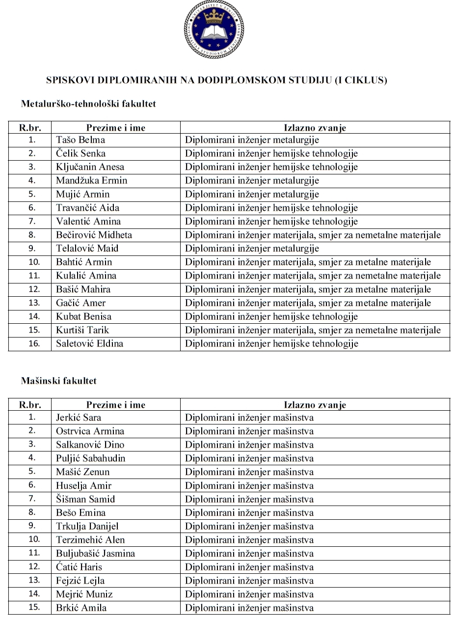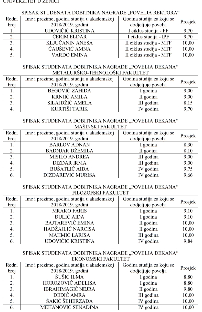 Tako su priznanja “Povelja rektora” dobili Kristina Udovičić (prosjek ocjena 9,70) sa Filozofskog fakulteta i Eldar Ćerim (9,70) sa Islamsko-pedagoškog fakulteta, završenici I ciklusa te Anesa Ključanin, Amna Čaušević i Emina Vardo sa II ciklusa, inače svi postdiplomci Metalurško-tehnološkog fakulteta, koji su imali prosjek ocjena 10.