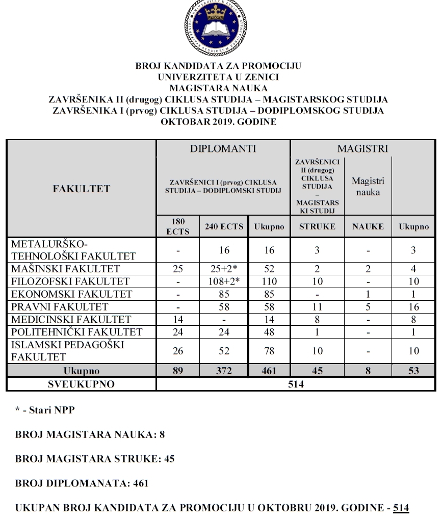 Univerzitet u Zenici (UNZE) promovirao je danas u Gradskoj areni “Husejin Smajlović” u Zenici novih 514 završenika I i II ciklusa studija, koji su na osam fakulteta tog univerziteta diplomirali u 2019. godini. Tokom ove godine diplome na 31 studijskom programu na osam fakulteta UNZE-a stekao je ukupno 461 student I ciklusa te 53 II ciklusa studija, od kojih je osam postdiplomaca steklo zvanje magistra nauka te njih 45 zvanje magistra struke.