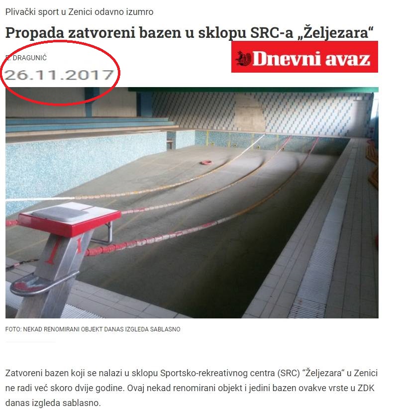 Prošlo je (nepunih) šest godina kako je prestao s radom jedini zatvoreni bazen u Zenici, prokomentarisao je na društvenim mrežama novinar portala Sportsport.ba Dino Kurbegović. Kolega koji intenzivno i svakodnevno prati sportska i društvena dešavanja u našem gradu naveo je da je “kroz šest godina Zenica izgubila više od 5.000 polaznika obuke za plivanje”.