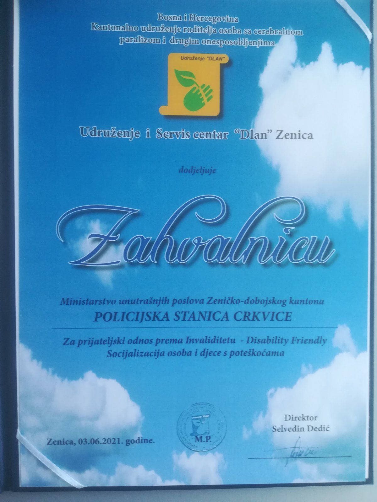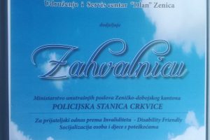 U okviru ove posjete, direktor udruženja “DLAN” Selvedin Dedić je komandiru Policijske stanice Crkvice Vidović Damjanu uručio zahvalnicu Policijskoj stanici Crkvice za prijateljski odnos prema invaliditetu, te značajan doprinos na socijalizaciji osoba i djece sa poteškoćama.