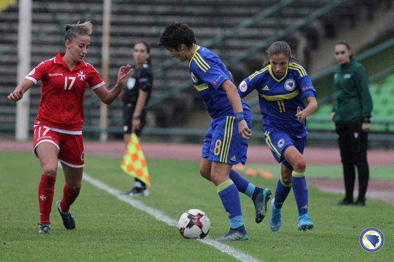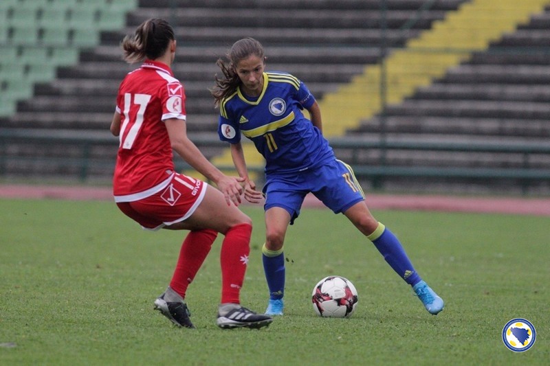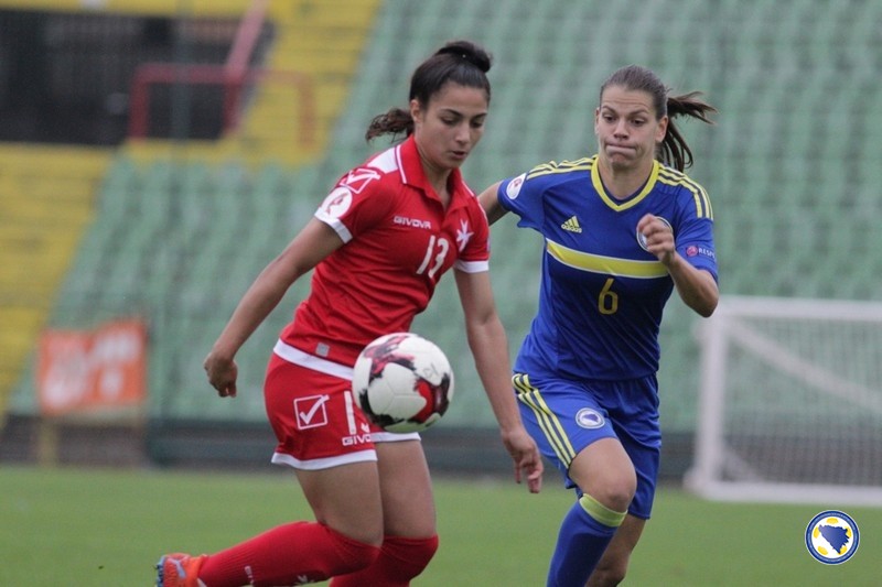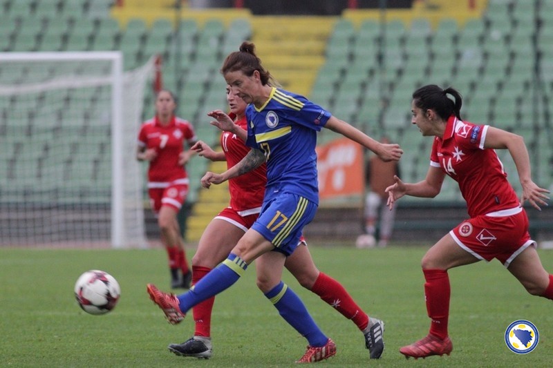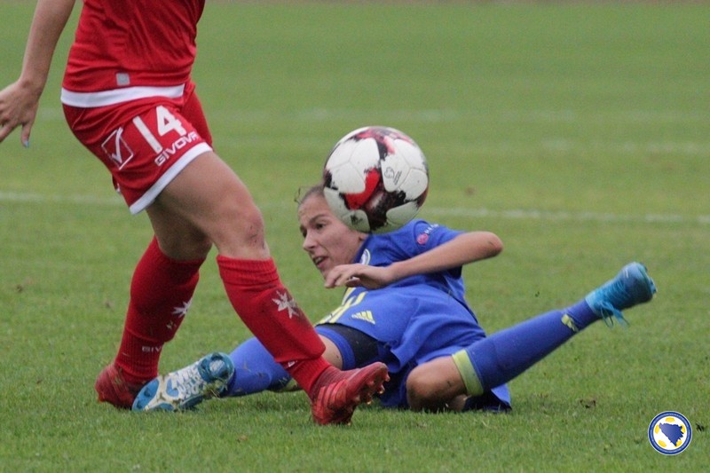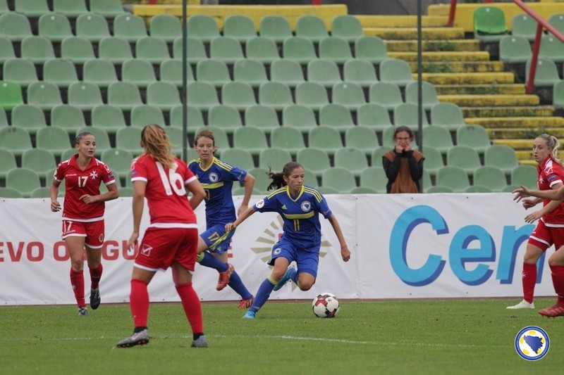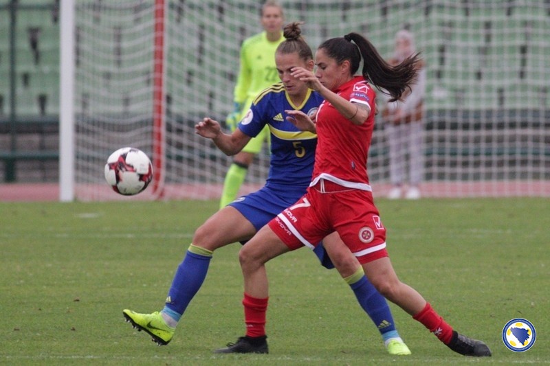 U prvih 45 minuta terensku inicijativu je imao bh. tim, a najbolje prilike su propustile Aida Hadžić u 11′ kad je glavom loptu poslala pored gola, te Dajana Spasojević u 17′ kad su reprezentativke Malte izblokirale njen pokušaj iz povoljne pozicije.