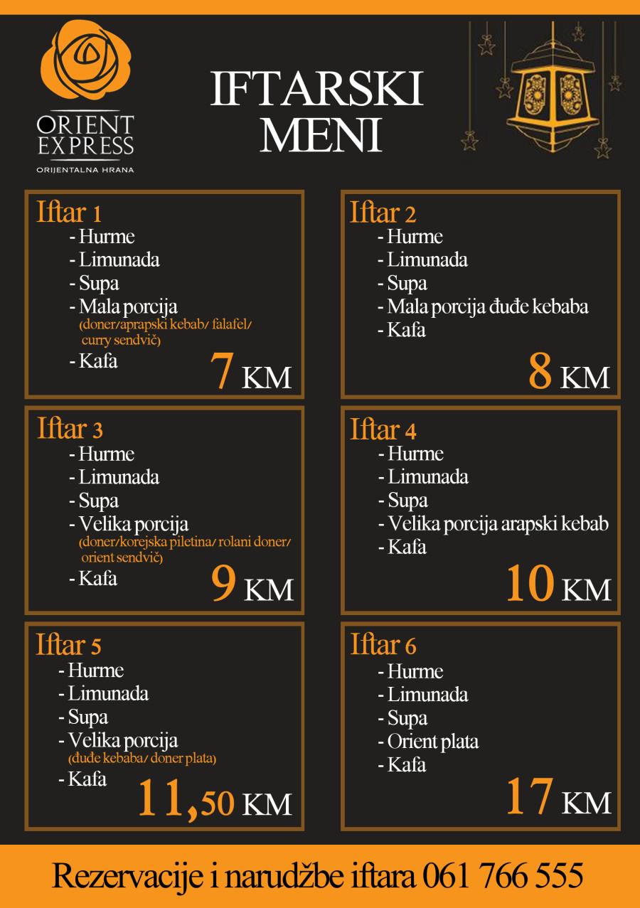 FOTO: Iftari u Orient Expressu – od 7 KM – rezervacija stola ili kućna dostava – Došao nam je najdraži gost: mubarek mjesec Ramazan. I ove godine Orient Express je pripremio bogatu iftarsku ponudu po izuzetno pristupačnim cijenama.