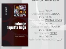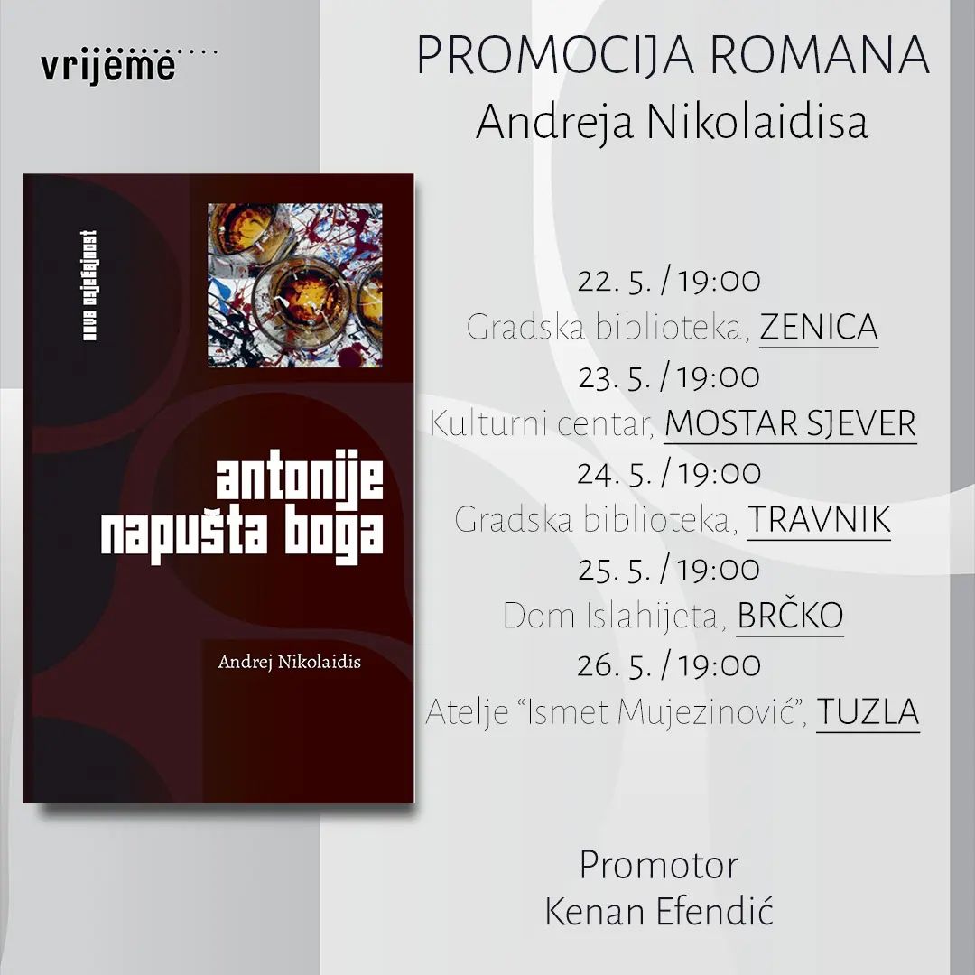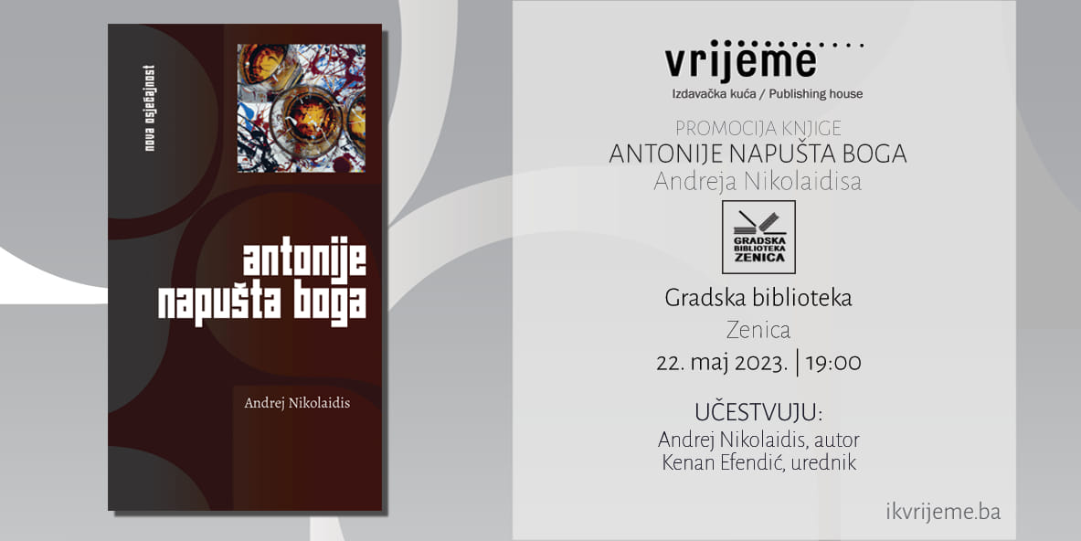 Prva promocija knjige autora “Antonije napušta Boga” autora Andreja Nikolaidisa održana je u organizaciji Gradske biblioteke Zenica i Izdavačke kuće Vrijeme, izdavača knjige.