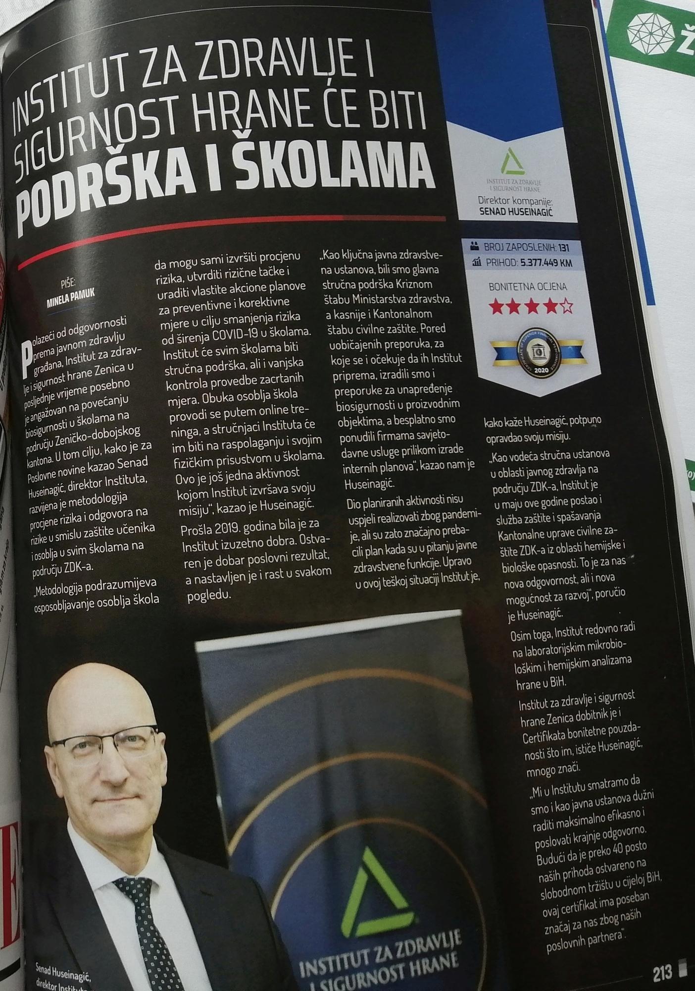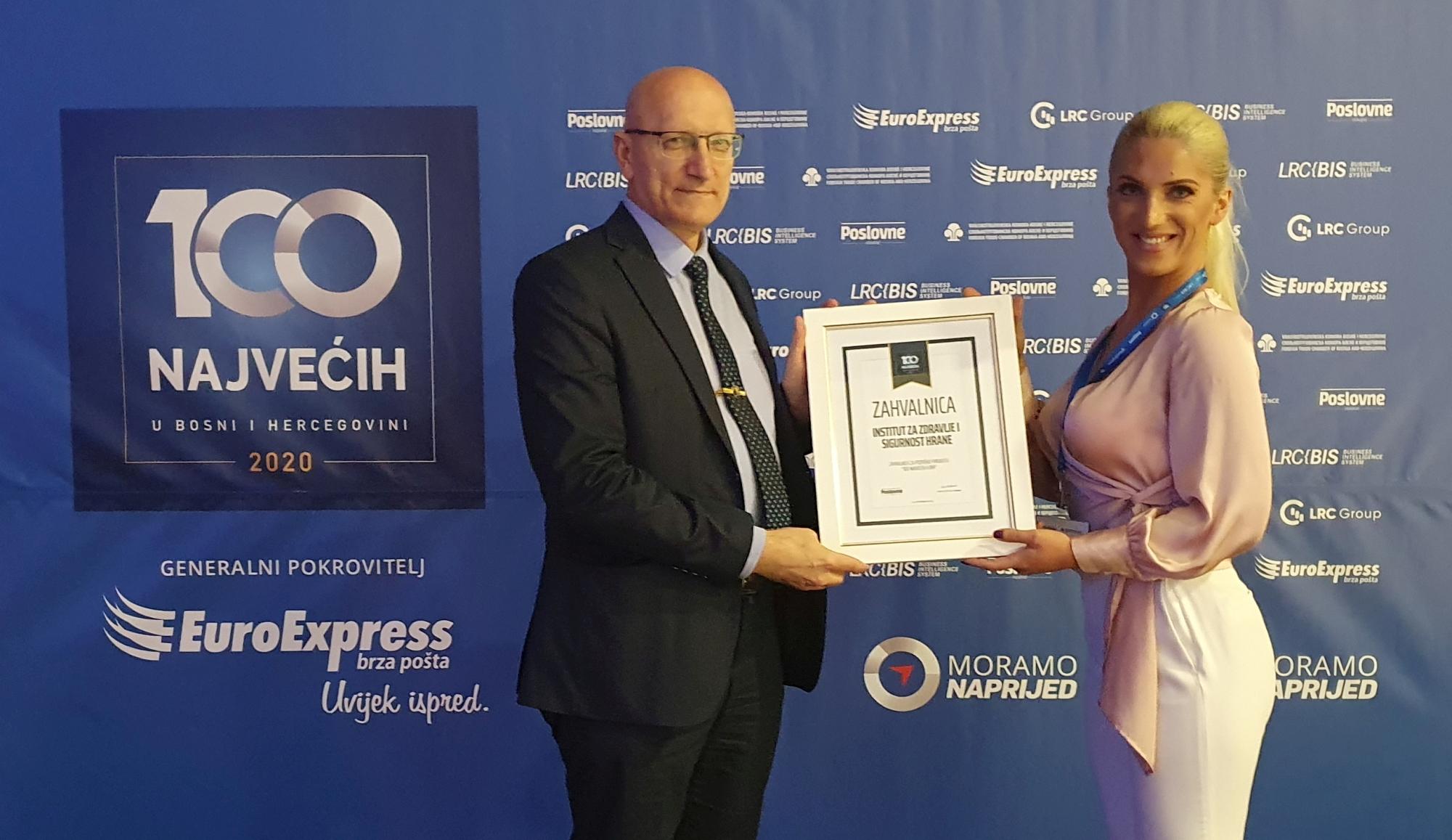 Institut za zdravlje i sigurnost hrane Zenica ove godine je bio učesnik manifestacije i projekta “100 najvećih u BiH”, koja je proteklih dana, po 33. put, realizirana u Sarajevu. Na svečanosti, na kojoj su dodijeljena priznanja za najbolje kompanije, direktor INZ-a prim.dr. Senad Huseinagić je od organizatora primio zahvalnicu za pomoć u realizaciji projekta.