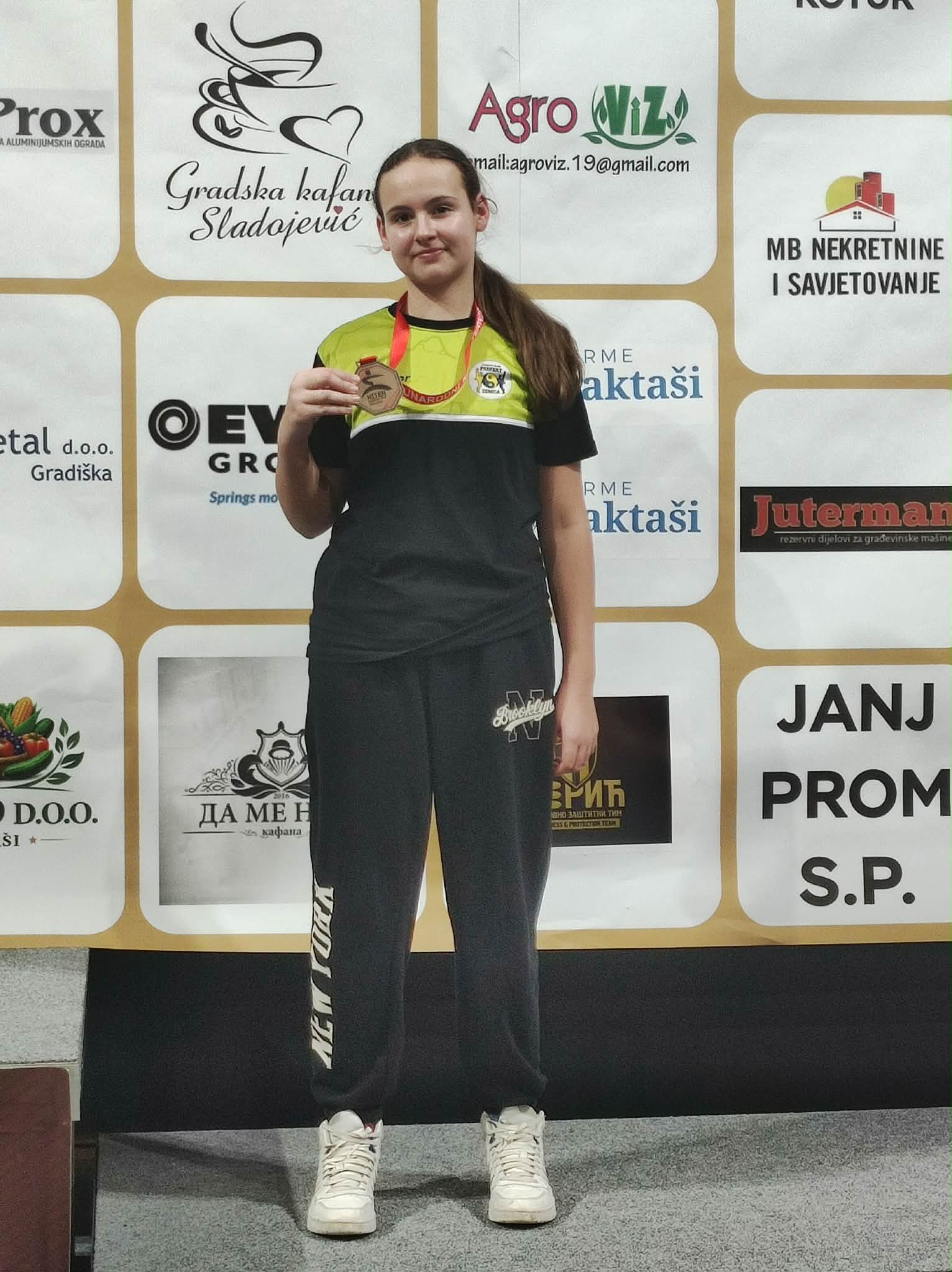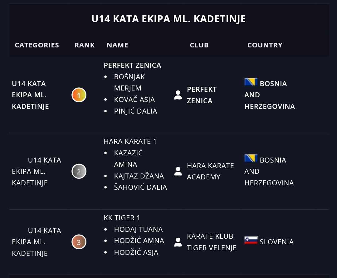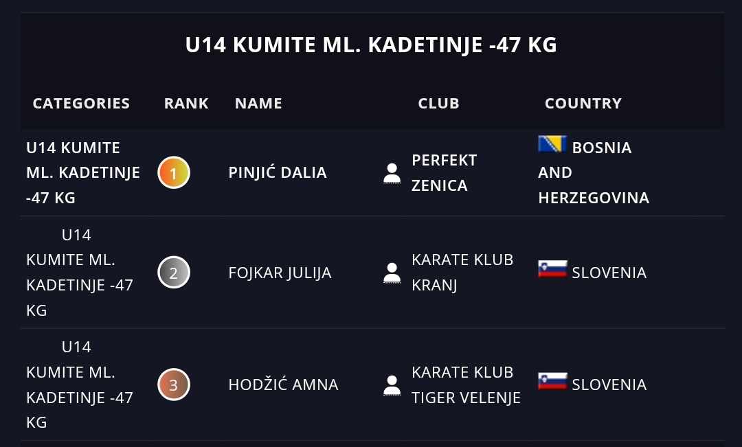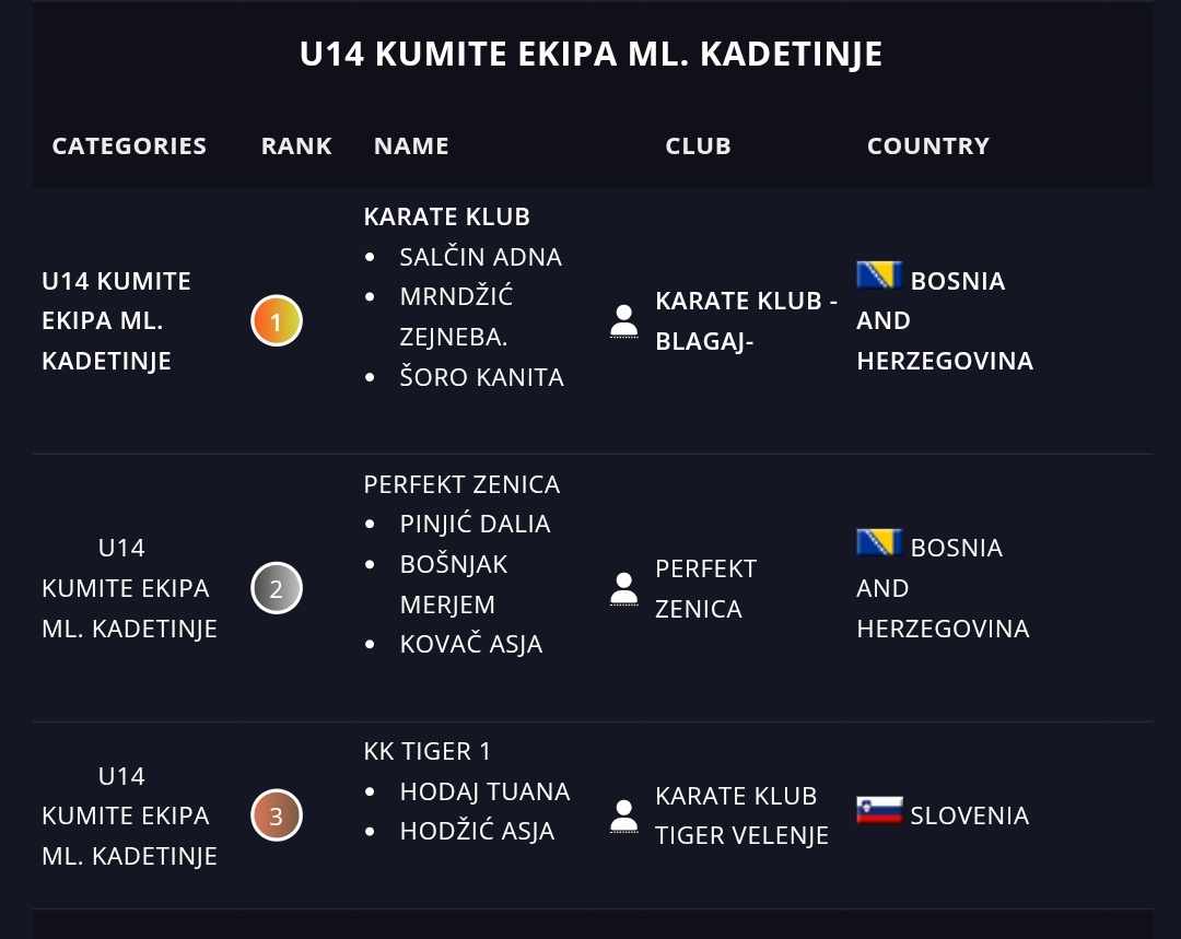 Zlatne medalje osvojile su Dalia Pinjić (U14 kumite, mlađe kadetkinje -47 kg) te U14 kata ekipa mlađih kadetkinja u sastavu Merjem Bošnjak, Asja Kovač i Dalia Pinjić. Srebrene medalje pripale su Asji Kovač (U14 kumite, -42 kg) te U14 kumite ekipi mlađih kadetkinja (Pinjić, Bošnjak i Kovač). Bronzane medalje osvojile su Merjem Bošnjak (U14 kumite 52+ kg) i Dalia Pinjić (U14 kata), dok je Asja Kovač zauzela peto mjesto u kategoriji U14 kata. Ekipu je predvodio trener Nermin Gagi Bošnjak.
