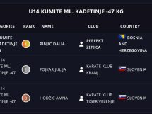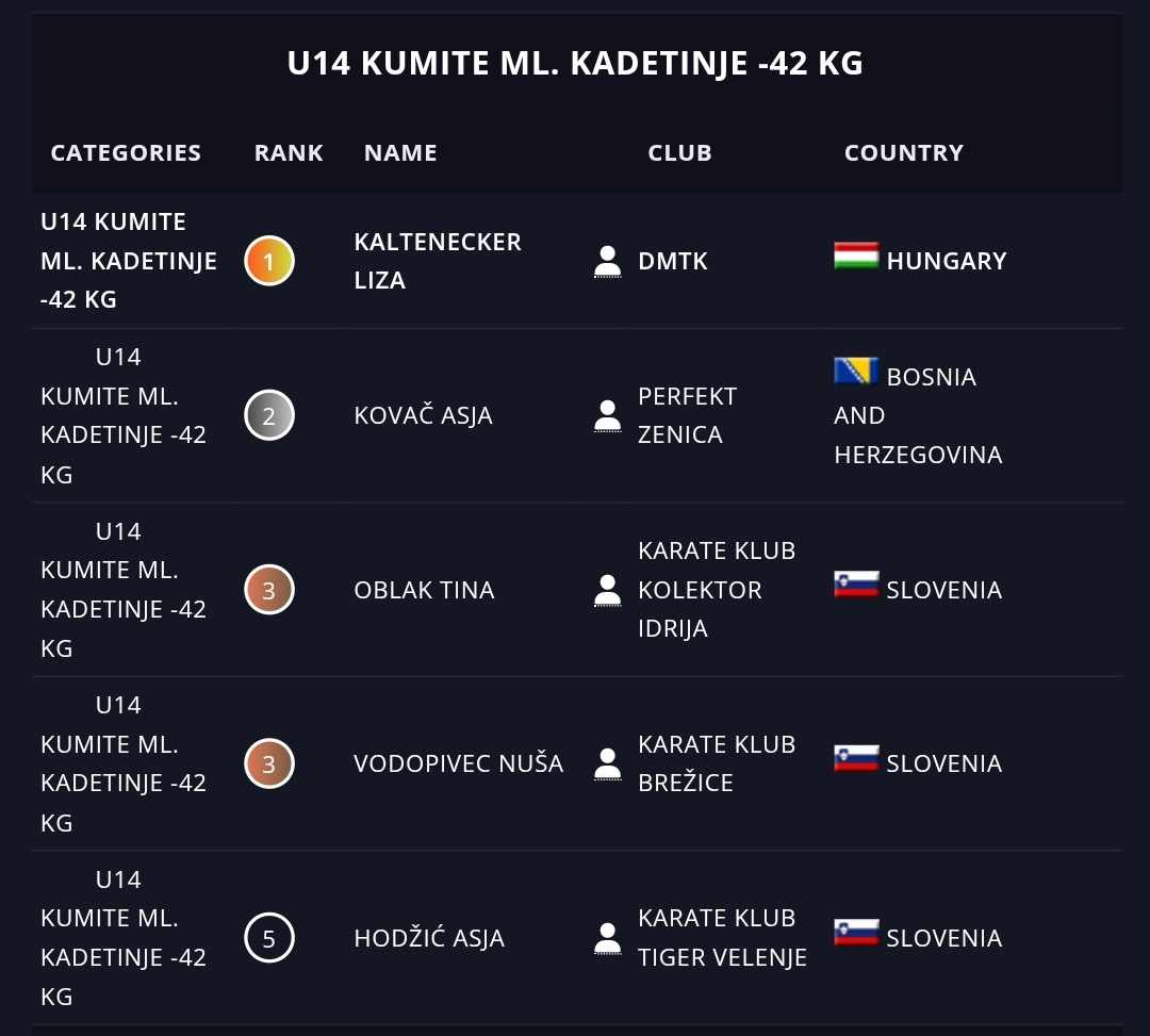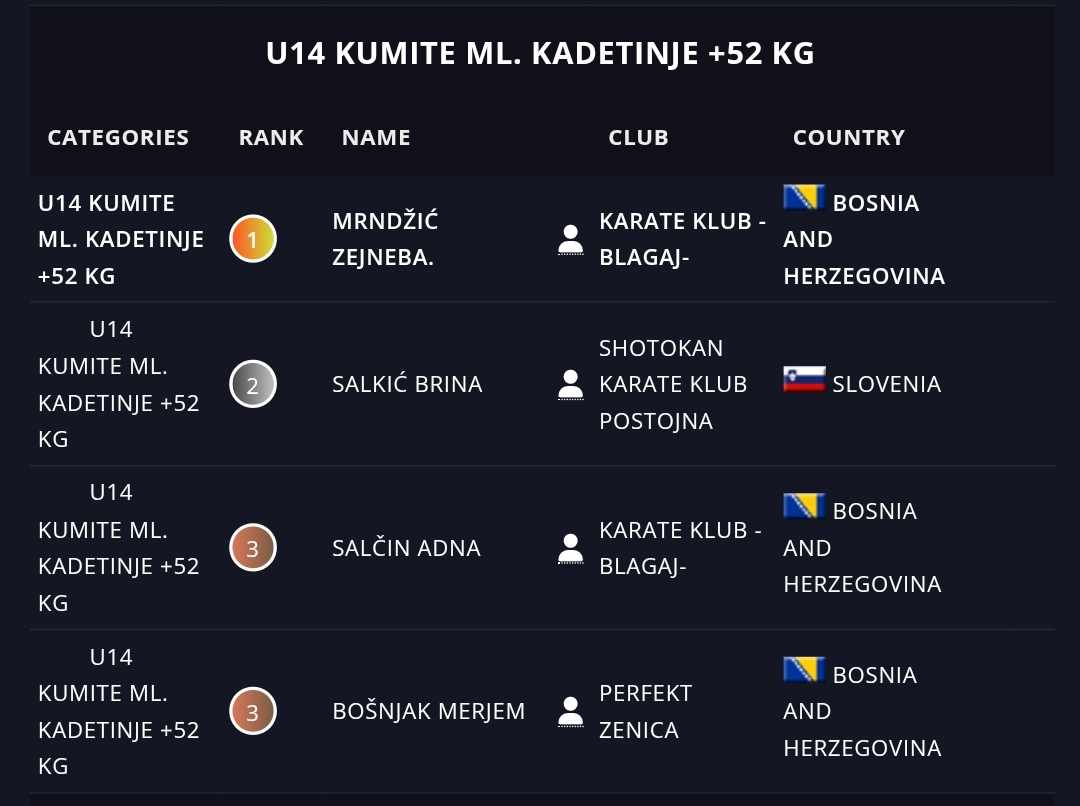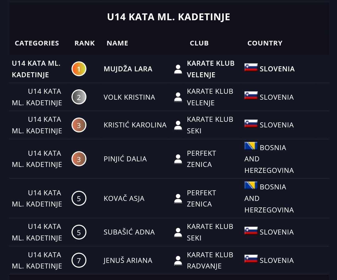 Zlatne medalje osvojile su Dalia Pinjić (U14 kumite, mlađe kadetkinje -47 kg) te U14 kata ekipa mlađih kadetkinja u sastavu Merjem Bošnjak, Asja Kovač i Dalia Pinjić. Srebrene medalje pripale su Asji Kovač (U14 kumite, -42 kg) te U14 kumite ekipi mlađih kadetkinja (Pinjić, Bošnjak i Kovač). Bronzane medalje osvojile su Merjem Bošnjak (U14 kumite 52+ kg) i Dalia Pinjić (U14 kata), dok je Asja Kovač zauzela peto mjesto u kategoriji U14 kata. Ekipu je predvodio trener Nermin Gagi Bošnjak.