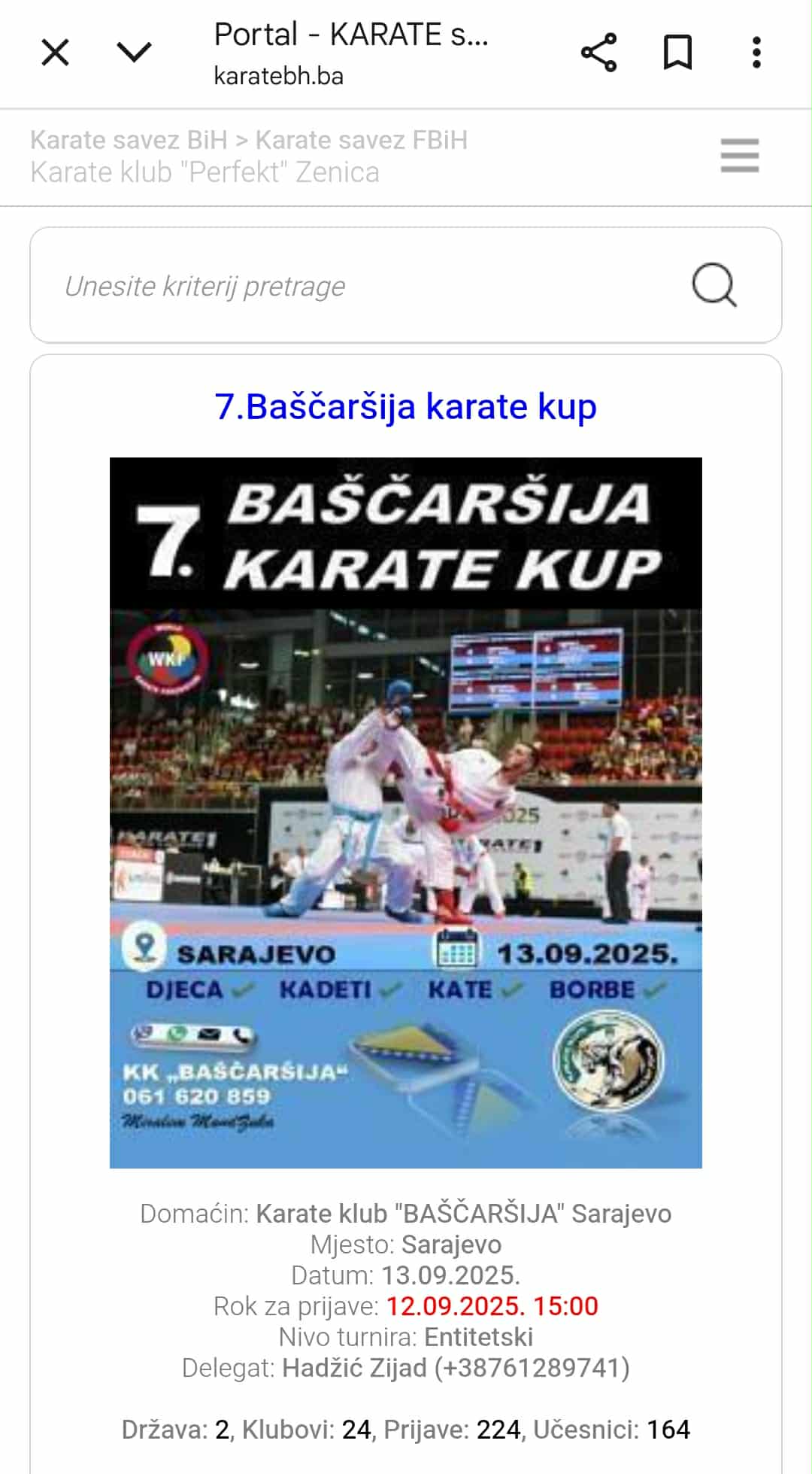 Na ovom prestižnom takmičenju učestvovalo je 164 takmičara sa 224 prijave iz 24 kluba iz Hrvatske i Bosne i Hercegovine. Organizatoru, Karate klubu „Baščaršija“ Sarajevo, upućujemo čestitke na odličnoj organizaciji turnira.