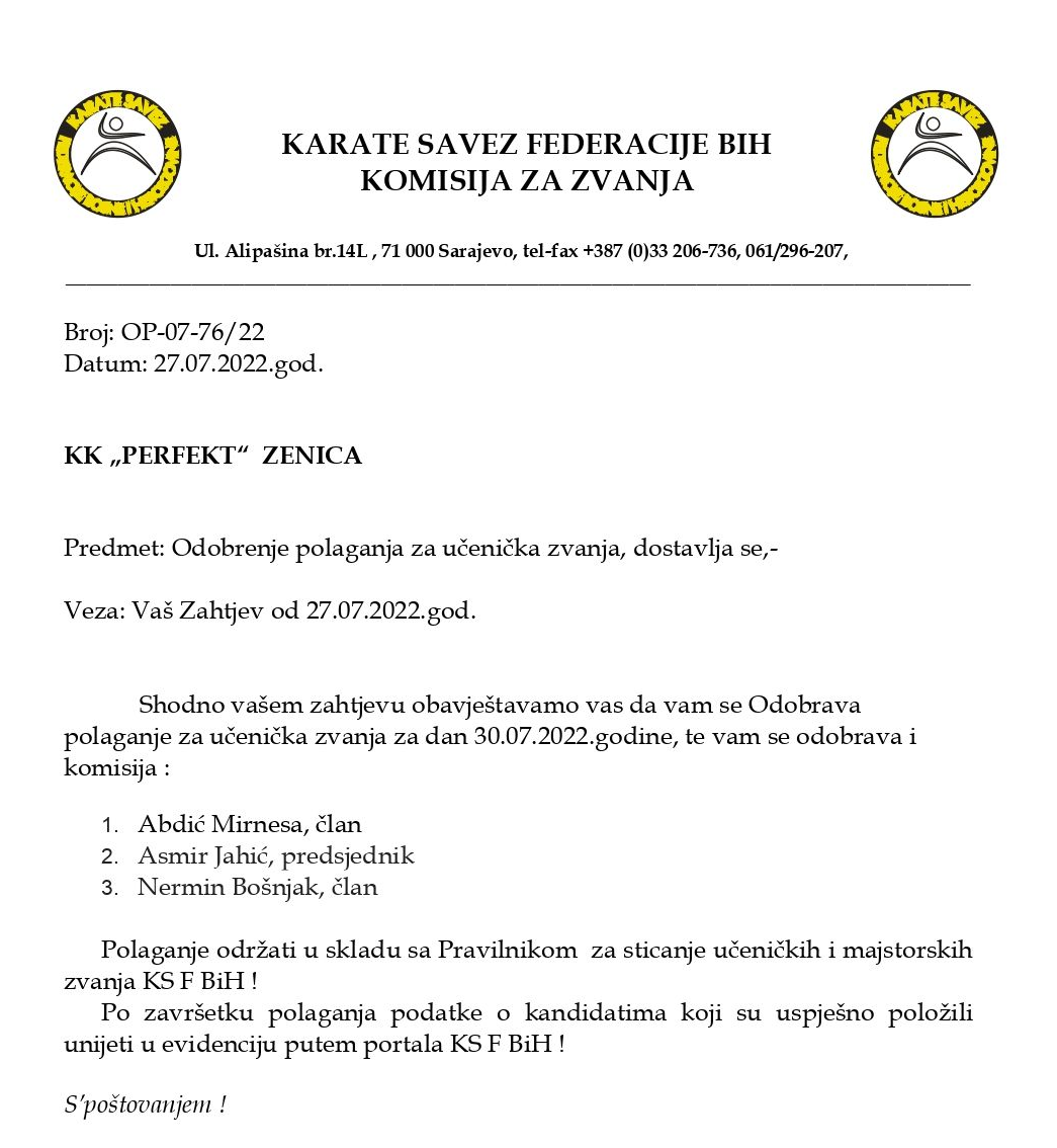 Polaganje je unaprijed najavljeno i odobreno od Komisije za zvanja Karate Saveza Federacije Bosne i Hercegovine.