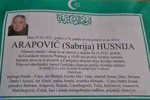 Mnogobrojni prijatelji, rodbina, sportske kolege i poznanici oprostili su se danas poslijepodne na Gradskom groblju Prašnice u Zenici od istaknutog sportskog radnika i nogometnog stručnjaka Husnije Arapovića. Čovjek koji je ostavio trag u bh. i zeničkom sportu preminuo je jučer ujutro u porodičnom domu LINK INFORMACIJA OVDJE. Nakon ispratne dove u Čaršijskoj džamiji, na groblju-mezarju Prašnice je klanjana dženaza i obavljen ukop.