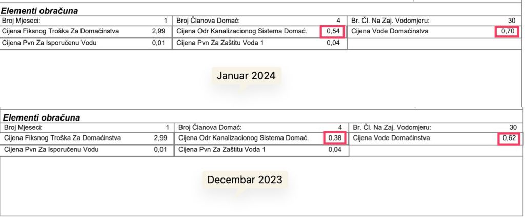 U 2021. i 2022. godini, ta cijena je prema važećem Cjenovniku trebala biti 0,84 KM plus PDV (0,56 voda +0,28 kanalizacija), a u prošloj 2023. – 1,00 KM (0,62 voda+0,38 kanalizacija).