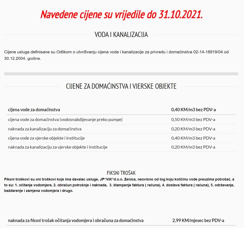 Tako je prema zvaničnoj stranici ViK-a, od 30.12.2004. do 31.10.2021. cijena vode za domaćinstvo bila 0,40 KM bez PDV-a kanalizacije 0,20 KM po potrošenom kubiku – dakle na jedan utrošeni kubik plaćalo se 0,60 KM.