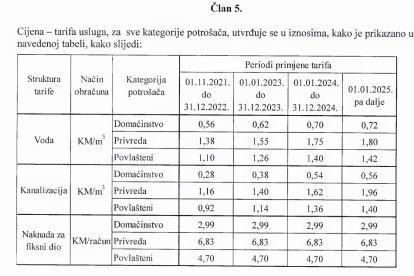 Naime, prema gradonačelnikovoj Odluci od 1.1.2025., kubik vode će biti 1,28 KM (0,72 za vodu+0,56 za kanalizaciju). Odnos cijena, poskupljenja za kategoriju privrede i “povlaštenih objekata” donosimo u tabeli ispod.