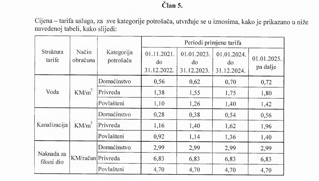 Naime, prema gradonačelnikovoj Odluci od 1.1.2025., kubik vode će biti 1,28 KM (0,72 za vodu+0,56 za kanalizaciju). Odnos cijena, poskupljenja za kategoriju privrede i “povlaštenih objekata” donosimo u tabeli ispod.
