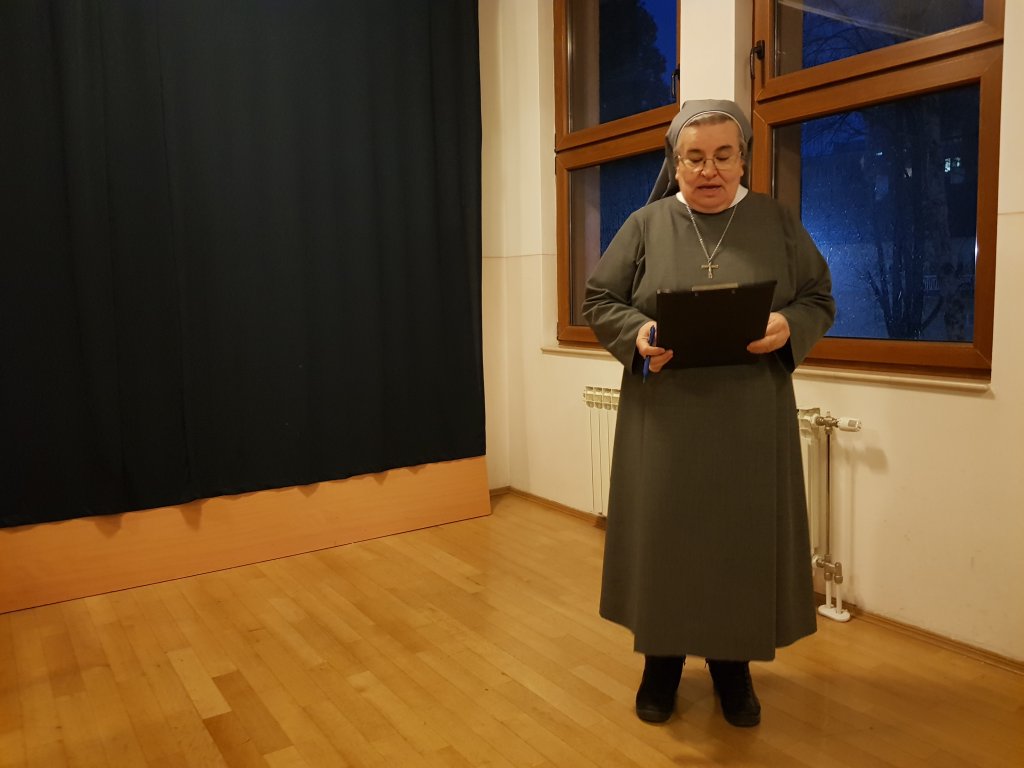 Na početku sve nazočne pozdravila je moderatorica tribine s. Gabrijela Hrgić: „Ponovno smo zajedno i vjerujem otvorena srca čuti, razumjeti, učiti i na kraju živjeti ono o čemu slušamo i razgovaramo. Usuđujem se reći da je prva tribina bila svojevrsni uvod u ovu drugu tribinu s temom: Opraštanje, instrumentalizacija prošlosti i viktimizacija. A i da ova najavljena tema odgovara vremenu i trenutku koji živimo. Profesorice, Maros dobro nam došli. Vidimo vas često na malim ekranima pa smo sretni da ste večeras uživo s nama.“