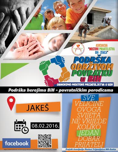Mostovi prijateljstva u posjeti Jakešu – Asocijacija Mostovi Prijateljstva BiH-Zenica danas je posjetila povratničko naselje Jakeš u općini Vukosavlje, i za nekoliko stotina mještana (djeca i odrasli), organizovala bogat kulturno-umjetnički program u kojem je učestvovalo 35 osoba ( KUD Plamen-Pehare, orkestar GUD Filigran, pjevači Omer Kadrić, Aiša Zaimović, Hajrudin Halać-Heli, Mujo Aganović, mađioničar Arabello).