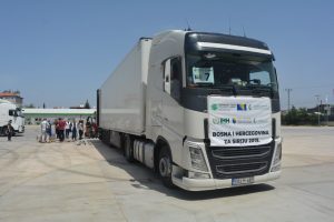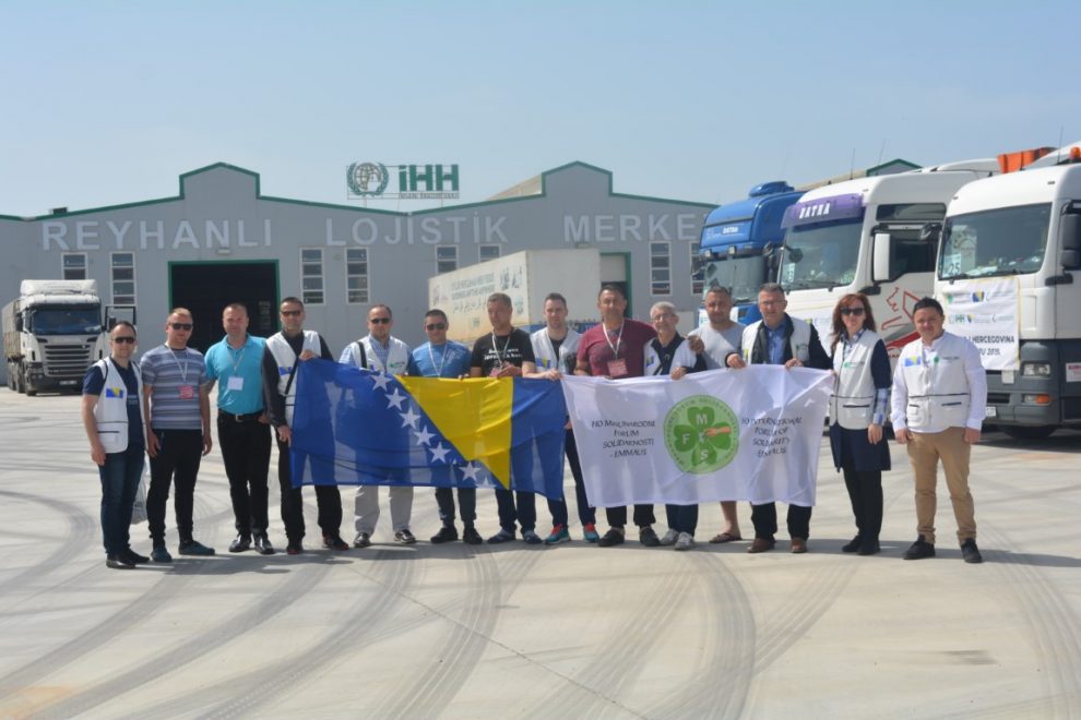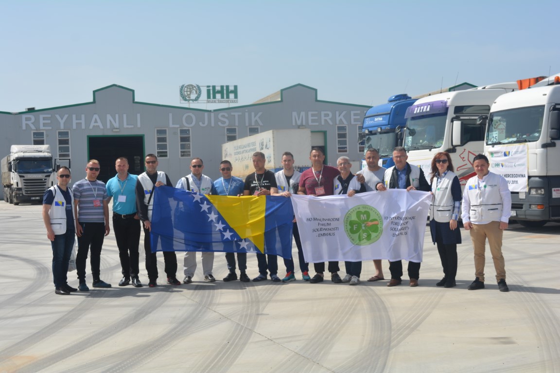 FOTO: Najveći konvoj pomoći iz BiH za sirijske izbjeglice stigao u Reyhanli – Najveći konvoj humanitarne pomoći iz Bosne i Hercegovine koji je MFS-EMMAUS poslao 17. aprila, danas je stigao u Rejhanlı, grad u blizini tursko-sirijske granice. Konvoj su dočekali predstavnici MFS-EMMAUS-a zajedno sa predstavnicima Islamske zajednice (Šemso Germić – glavni imam MIZ Ljubuški, Džemal ef. Salkić – Koordinator za društvenu brigu Muftijstva zeničkog, Rašid Orlović – tehnički sekretar MIZ Tešanj, Esad Fuško – Koordinator za društvenu brigu pri MIZ Travnik, Amer Osmanović – Koordinator za društvenu brigu pri MIZ Zvornik te Amela Jordamović predstavnica Medija centra Islamske zajednice. Šest stotina tona osnovnih životnih namirnica koje su građani naše zemlje donirali preko muftijstva tuzlanskog, travničkog, zeničkog i mostarskog dostavljeno je u logistički centar organizacije IHH – a, odakle će pomoć biti isporučena u kampove sa sirijskim izbjeglicama te u pekare kojih trenutno ima tri. Dio troškova prevoza osigurali su Federalno ministarstvo raseljenih osoba i izbjeglica, Vlada TK te turska organizacija IHH.