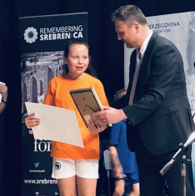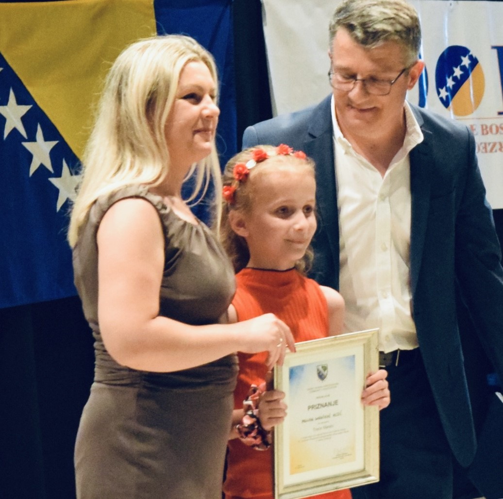 Melina Saračević Hujić  je osvojila treće mjesto u likovnim radovima. Melina je rođena 7.Jula 2010. U Koventriju gdje raste i pohađa školu. Melina je vrlo aktivna I pametna djevojčica koja uvijek pored  igranja I druženja sa prijateljima odvoji vrijeme za učenje, nova zanimanja I hobije. Tako je počela da crta I piše o onom što vidi u školi I na TV. Svoje slobodno vrijeme je odvojila za plivanje, gimnastiku I ples, a svaku subotu je rezervisala za bh.dopunskuškolu. Zadnje tri godine na susretima Bosanskih Škola uvijek donese medalju kući za likovne radove, jednom je dobila prvo mjesto, a dva puta je dobila treće mjesto. Voli da provede dosta vremena sa svojom braćom malim Dinom I velikim bratom Amirom, a I sa svoja dva psa, koje jako voli. Uživa u parku da ih izvede I igra sa njima. Najviše voli da ide u kupovinu sa svojom nanom koju jako voli I uvijek je jako lijepo sluša.