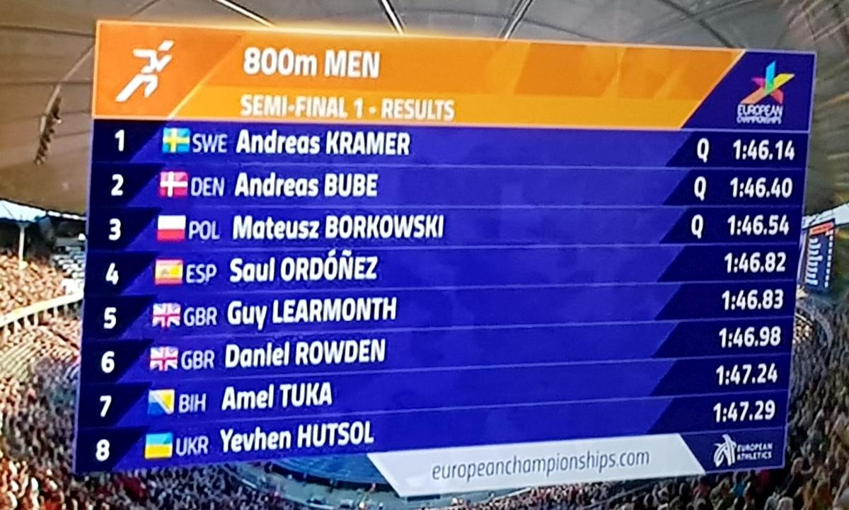 Prvo mjesto u ovoj polufnalnoj utrci je pripalo Šveđaninu Andreasu Krameru koji je trku istrčao u vremenu 1:46.16. Drugi je bio Bube (1:46.40), a treći Mateuzs Borkowski (1:46.54)