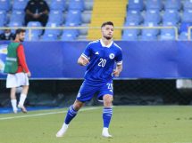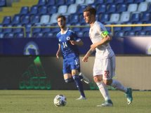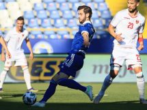 Vladimir Jovović u 23′ centrira sa desne strane, a kapiten Crne Gore Fatos Beqiraj glavom sa peterca loptu šalje pored gola.