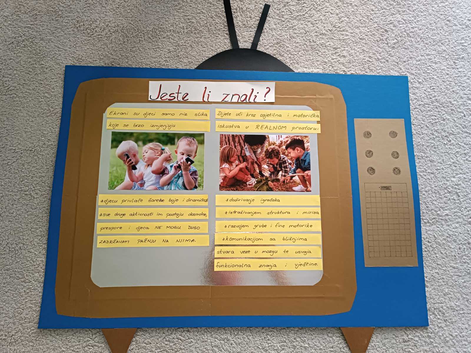 U odgojnim grupama realizirane su pedagoške radionice s ciljem poticanja medijske pismenosti kod djece i osposobljavanja za upotrebu digitalne tehnologije na siguran način. Koristeći metode prilagođene svakom uzrastu ponaosob, djeci su predočene koristi i rizici upotrebe digitalne tehnologije, te kako prepoznati neprimjerene sadržaje i kako reagirati na njih, pritom potičući djecu na kritičko mišljenje. Također se radionicama nastojao pobuditi interes kod djece za brojne druge zabavne sadržaje koji ne zahtijevaju upotrebu ekrana.