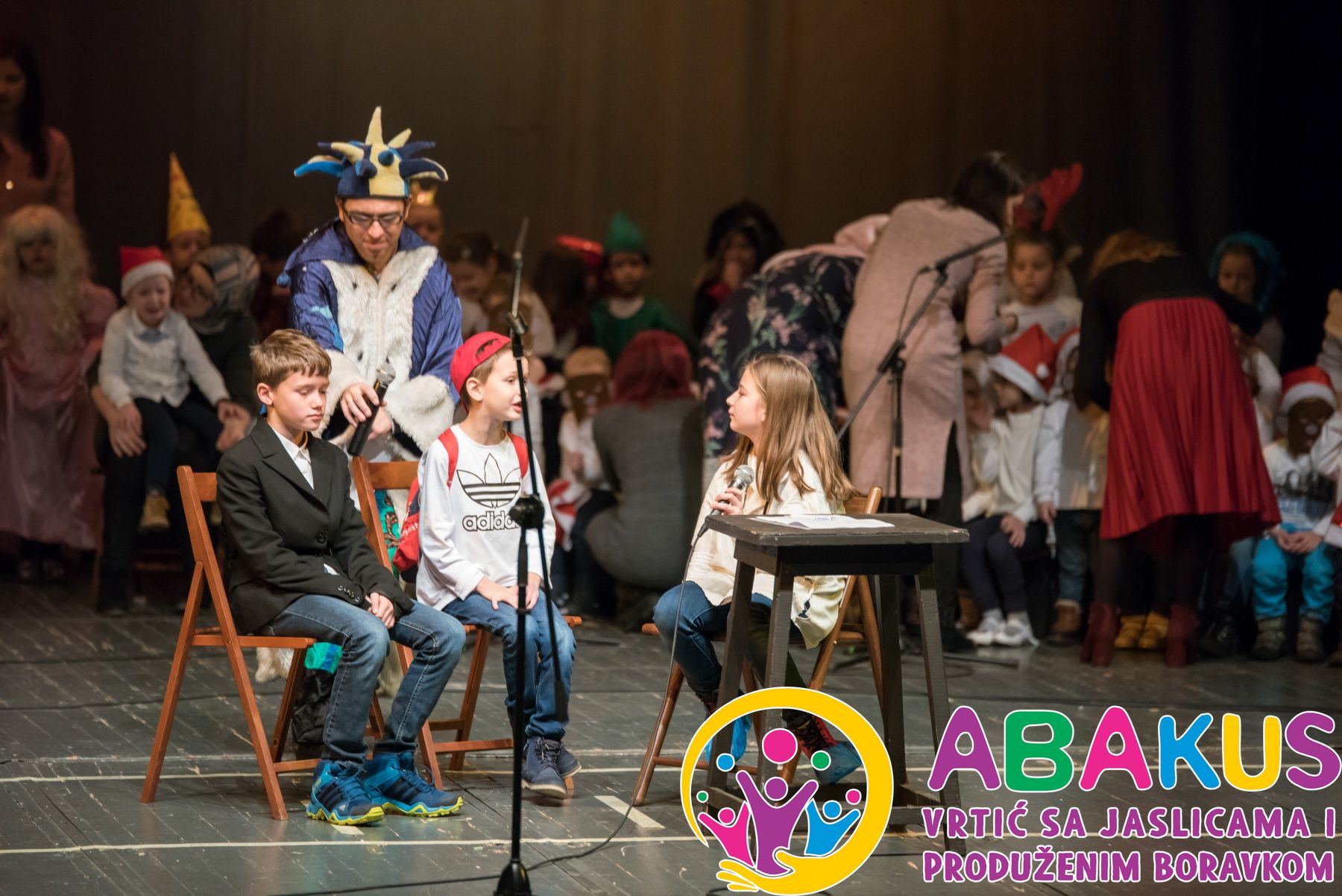 Stariji vrtićanci su pokazali kako se pripremaju za školu u okviru boravka u „Abakusu“, te su izveli igrokaze: „Pismo za Djed Mraza“ i „Cvrčak i Mrav“, a recitirali su pjesmu „Dvije pahulje“. Svoje plesne sposobnosti pokazali su kroz izvedbu tačke „Ide zima“, a osjećaj za ritam kroz izvedbu tapšalice „Bim bam“. Izvedbom pjesme „Zeko i potočić“, pakazali su i da znaju pjevati.