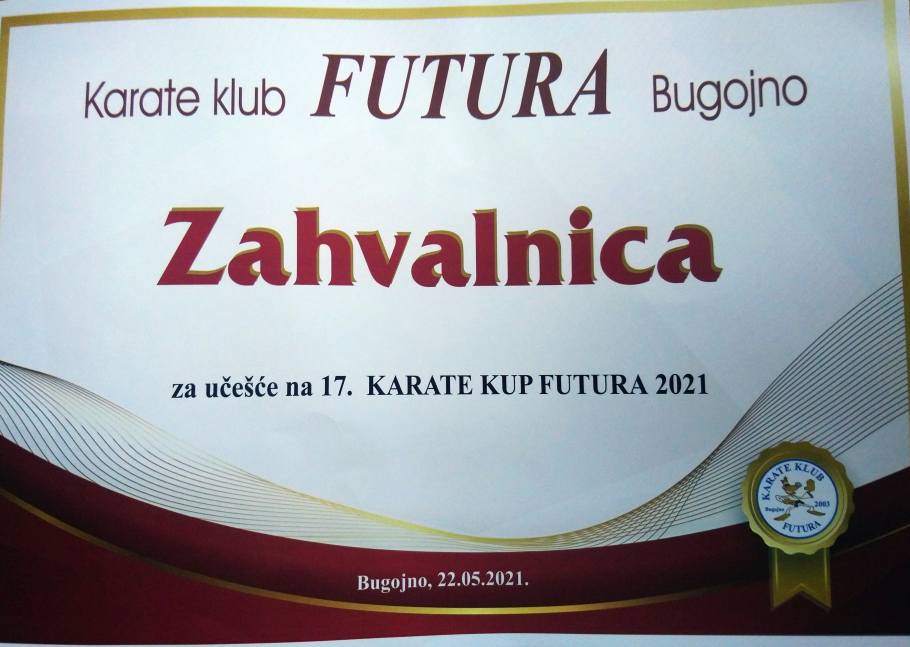 Organizator kupa je karate klub FUTURA Bugojno, kome iskreno čestitamo na izuzetno dobroj organizaciji, a još više posebno toploj dobrodošlici, te dobivenoj Zahvalnici.
