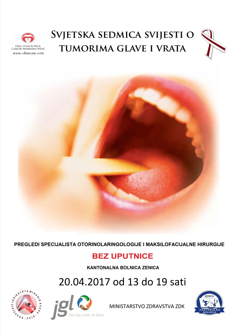 U okviru obilježavanja svjetske sedmice svijesti o tumorima glave i vrata koja se po peti put obilježava u KBZ kao jednoj od preko 400 lokacija širom svijeta danas su specijalisti otorinolaringologije i maksilofacijalne hirurgije bez uputnice i prethodnog naručivanja u periodu od 13 do 19 sati pregledali 100 pacijenata od kojih su pet uputili na dalju dijagnostičku obradu zbog sumnje na zloćudnu bolest. Još 32 pregledane osobe upućene su porodičnom ljekaru radi daljeg tretmana i terapije.