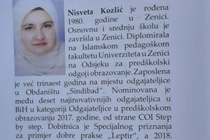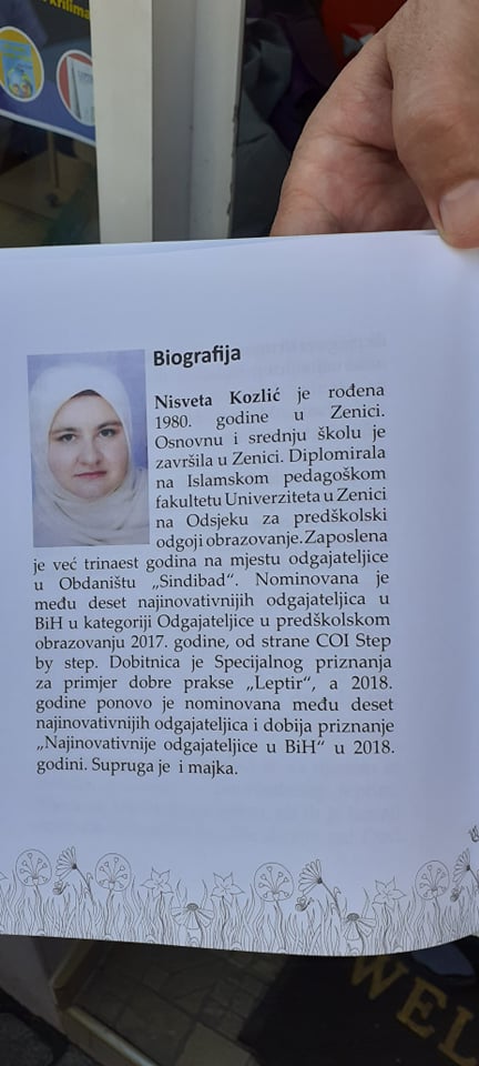 – Jednostavno, sve te događaje sam pretočila u priče i sačuvala od zaborava. Ovo je jedna lijepa aktivnost koja ima za cilj da djeci približi knjigu. Postoji nešto što se zove „efekat leptira“, a to je da jedan mali zamah leptirovih krila na jednom dijelu svijeta, može da napravi tornado na drugom. Inspirativna priča o dječaku je odjeknula daleko i poslala pozitivnu poruku koliko je važna rana intervencija u životu djece -, istakla je Nisveta za medije, te nam,na kraju, reče, da je žalosno da u Bosni i Hercegovini samo 17% djece pohađa vrtiće, a posebno su oštećena djeca iz ruralnih područja, te djeca sa poteškoćama u razvoju.