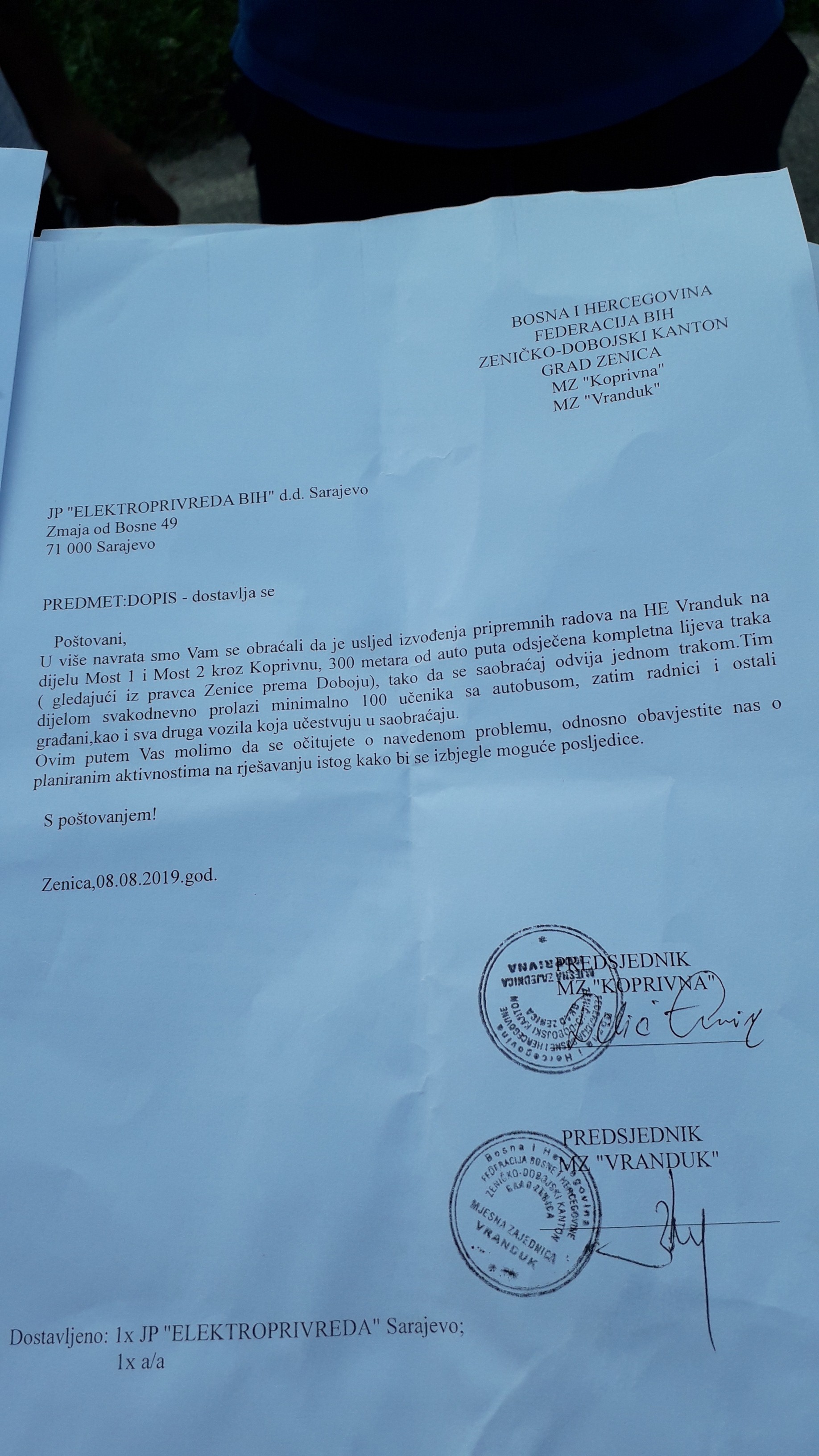 Predsjednik MZ Koprivna Emir Delić pokazuje nam i zahtjev koji su nekoliko puta podnijeli Elektoprivredi BiH za sanaciju odrona u dužini od 30-ak metara, koji se nalazi u pravcu bivšeg mjesta za branu i koji je posljedica od pripremnih radova za gradnju brane za HE Vranduk i preusmjerenja rijeke Bosne uz desnu obalu.