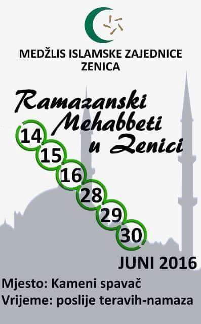 Iz Medžlisa Zenica pozivaju vas da budete dragi gosti na Ramazanskim mehabbetima. te da svojim prisustvom doprinesete lijepoj atmosferi na ovoj manifestaciji.