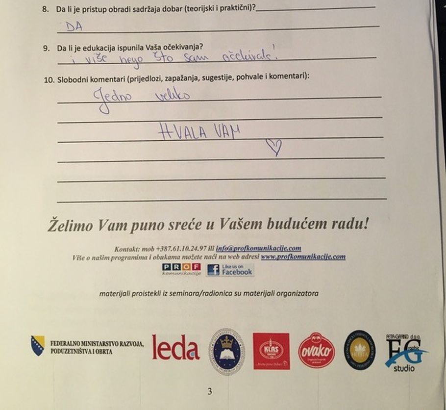 “Po Ruthu Schwanzeru svijet poimamo 78 posto putem vida, 13 posto putem sluha, tri posto putem opipa, tri posto putem mirisa i tri posto putem okusa. Zapamtimo 40 posto onoga što vidimo, no samo 20 posto onoga što čujemo. Ako je to zaista tako, onda su ove statistike najbolji dokaz zašto su potrebne edukacije na temu vizualnih komunikacija”, rekla je Alisa Vrabac, koordinatorica projekta ispred PROF komunikacija.