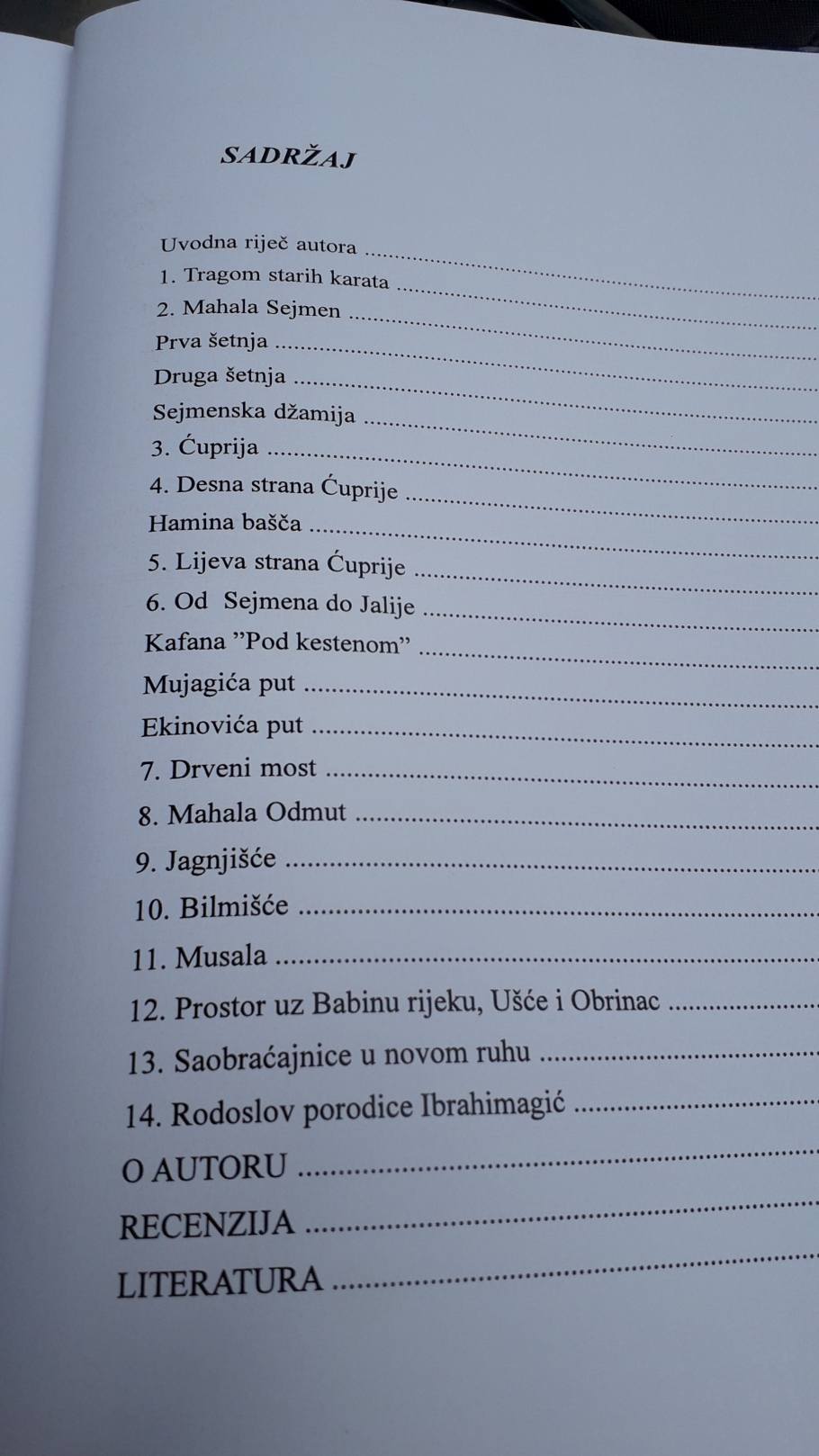 -Knjiga govori o mahalama Sejmen, te lokalitetima, Ćuprija, Odmut-Obala, Bilmišće, Jagnjišće i prostor uz ušće Babine rijeke. Knjiga ima negdje oko 1.300 imena, u sastavu porodica koje su u knjizi prikazane, njihov život, njihovo zanimanje, tegobe, veseli dijelovi u životu. To je ta ćuprija. Knjiga je posebna, jer u njoj postoje karte koje možda nikada do sada nisu objavljene, koje sam našao u katastru radeći kao inžinjer, sa fotografijama koje sam vadio iz svojih albuma, koje takođe nisu nikad objavljene. Na taj način htio sam da pokažem i kuće i porodice i njihova dešavanja.Kroz ovu knjigu mogu se vidjeti sve komšije moje, svi stanovnici od njihovih imena do njihovih zanimanja-, kazao je autor Ibrahimagić.