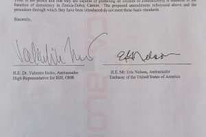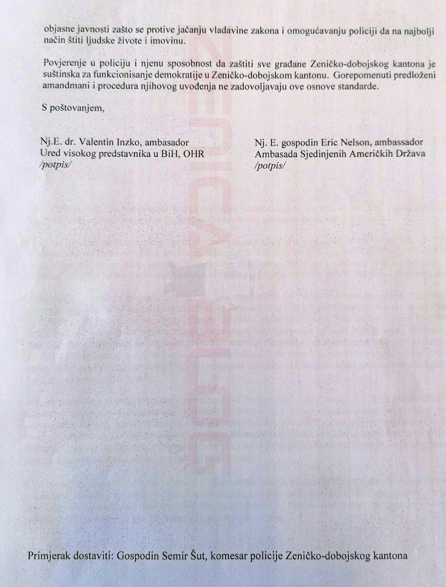 Iz kabineta Visokog predstavnika za BiH Valentina Incka (Inzko) na adresu Vlade i Skupštine Zeničko-dobojskog kantona (ZDK) danas je stiglo Pismo kojeg, zajedno, potpisuju Visoki predstavnik i ambasador Sjedinjenih Američkih Država u BIH njegova ekselencija Erik Nelson (Eric).