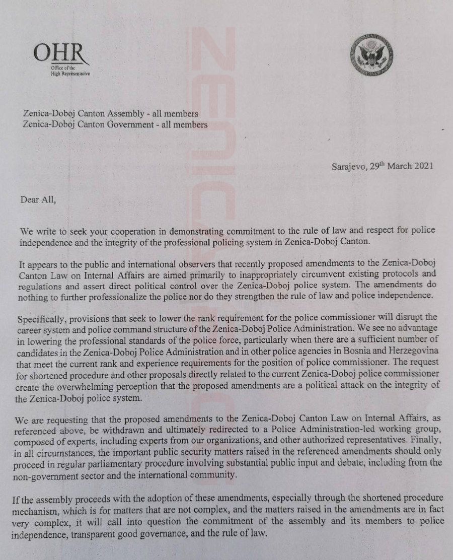 – Ukoliko Skupština nastavi sa procedurom usvajanja ovih amandmana – posebno kroz skraćeni postupak… dovešće se u pitanje opredjeljenost Skupštine i njenih poslanika nezavisnosti policije, transparentnoj dobroj vladavini, te vladavini zakona, navedeno je između ostalog u oštro toniranom Pismu OHR-a i Ambasade SAD Skupštini ZDK.