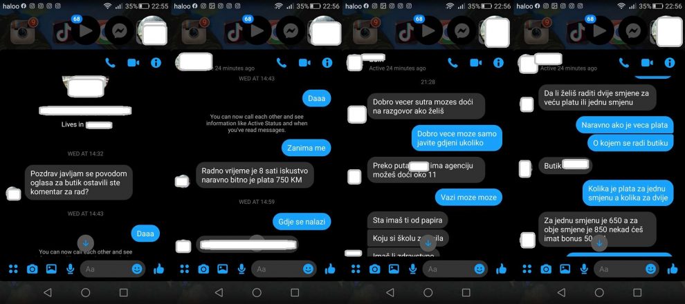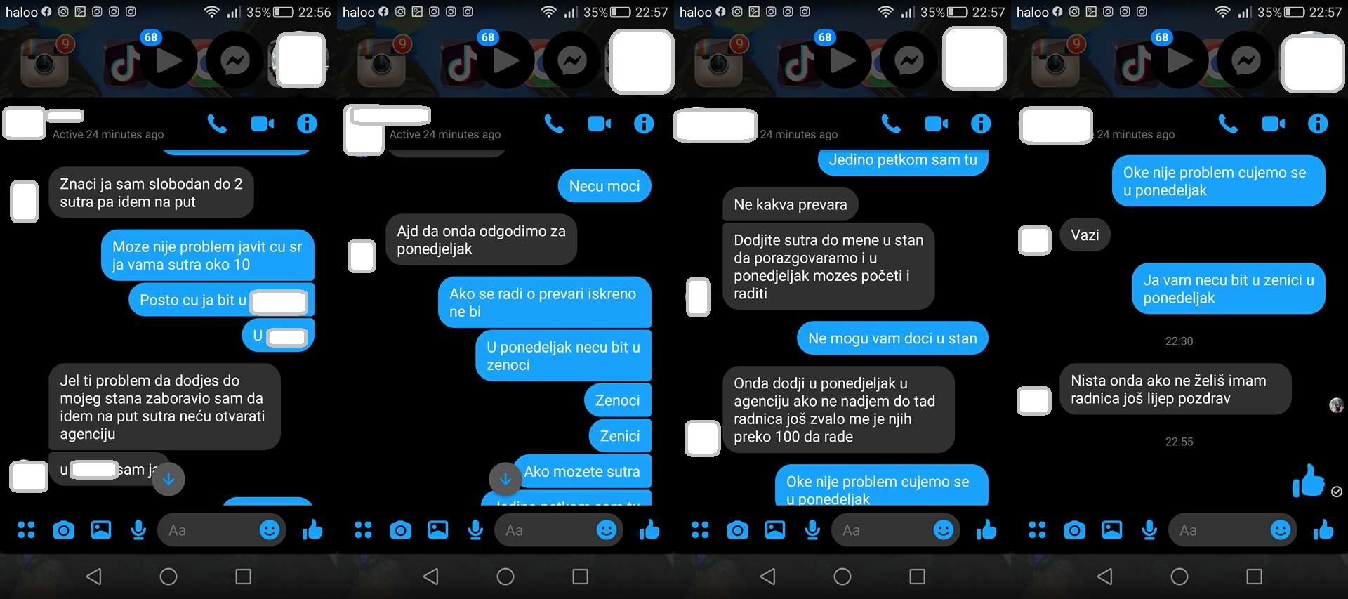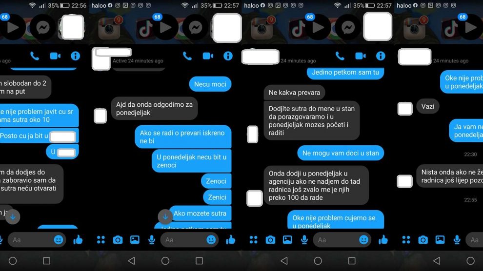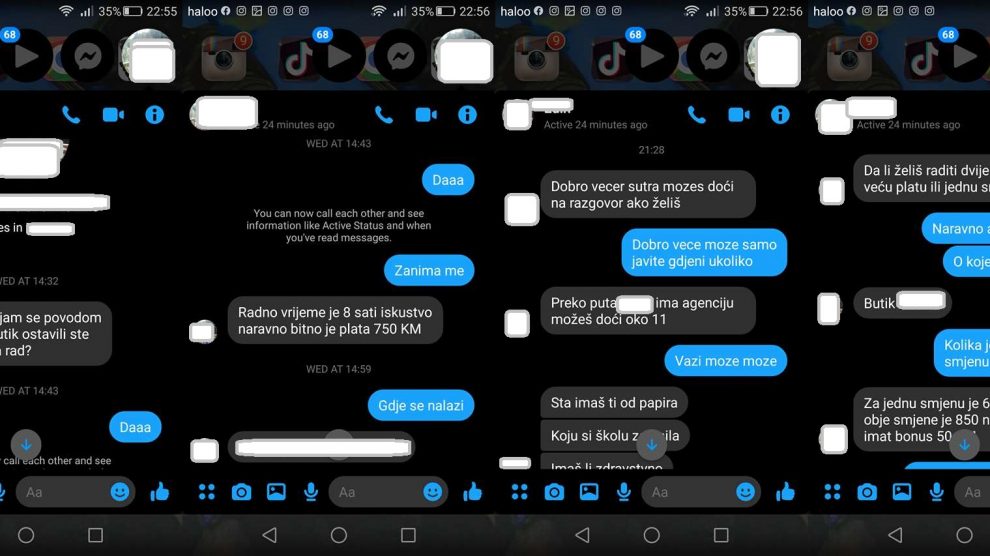 Našoj reakciji ustupila je “screenshootove” razgovora kojeg je vodila sa osobom koja se predstavila da se javlja u ime radnje, koja je tražila zaposlenicu. Nakon poziva da dođe na razgovor, muškarac koji je kontaktirao imao je drukčiji “prijedlog”, koji je ona učtivo odbila, a sve je rezultiralo “prestankom interesa” za njen angažman.