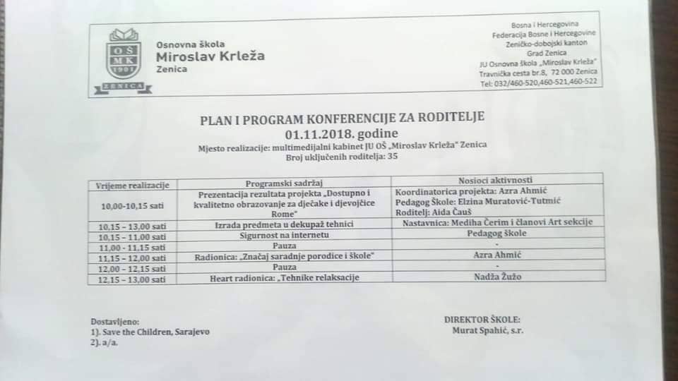 FOTO: OŠ “Miroslav Krleža” – Konferencija za roditelje – U okviru projekta “Dostupno i kvalitetno obrazovanje za djevojčice i dječake Rome”, u Osnovnoj školi “Miroslav Krleža” održana je konferencija za roditelje na kojoj su predstavljeni rezultati rada ovog projekta.