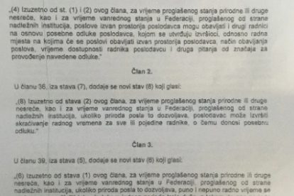 “Kriterije za ostvarivanje prava na plaćeno odsustvo za vrijeme vanrednog stanja u Federaciji utvrdit će poslodavac pravilnikom o radu ili općim aktom, uz prethodne konsultacije sa sindikatom, odnosno vijećem zaposlenika, imajući u vidu zaštitu sigurnosti i zdravlja radnika na radu, odnosno opravdane razloge radnika”, navodi se u novom tekstu izmjena i dopuna Zakona o radu.