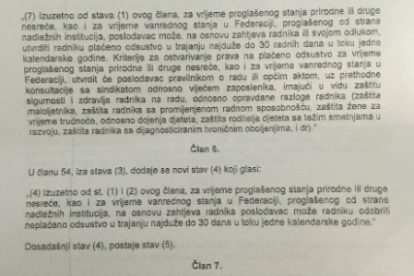 U tekstu nacrta predviđa se također da poslodavac na osnovu zahtjeva radnika, za vrijeme proglašenog stanja nesreće ili vanrednog stanja u FBiH, može odobriti neplaćeno odsustvo u trajanju najduže do 30 dana.
