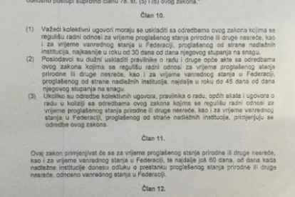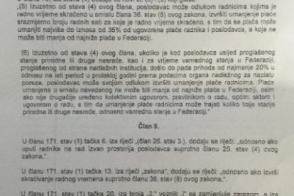 “Ukoliko je kod poslodavca usljed proglašenog vanrednog stanja ili nesreće došlo do pada prihoda od najmanje 20 posto u odnosu na isti period u protekloj godini, poslodavac može svojom odlukom izvršiti umanjenje plaće radnicima. Plaća umanjena u smislu navedenog ne može biti niža od najniže plaće u Federaciji BiH”, predviđa novi tekst Zakona o radu FBiH.