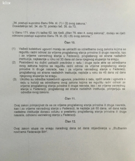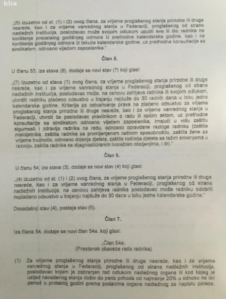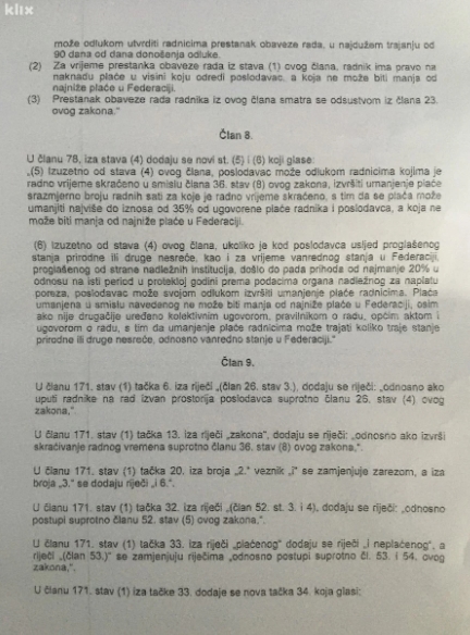 FOTO: Ovo je tekst izmjena Zakona o radu FBiH – Vlada FBiH usvojila je na jučerašnjoj sjednici Nacrt zakona o izmjenama i dopunama Zakona o radu FBiH kojim se predviđa da poslodavac može smanjiti plaću radnicima ukoliko mu prihodi opadnu za najmanje 20 posto.