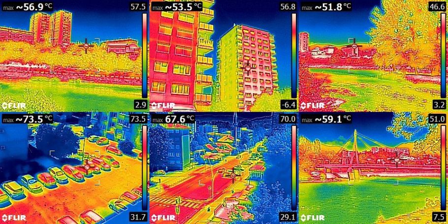 Na snimku ulice se vidi razlika između zagrijanog asfalta i drvoreda i razlika je 30 i više st. C i ne treba ni govoriti šta znači svako posađeno ili posječeno drvo. Razlika između Kamberovića polja i ulica u centru je preko 30 st. C, svaka zelena površina, trava, grm. drvo znači razliku između života i umiranja.