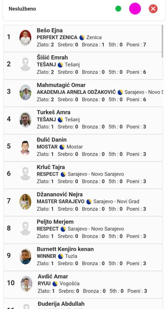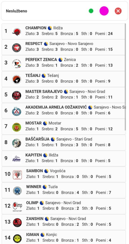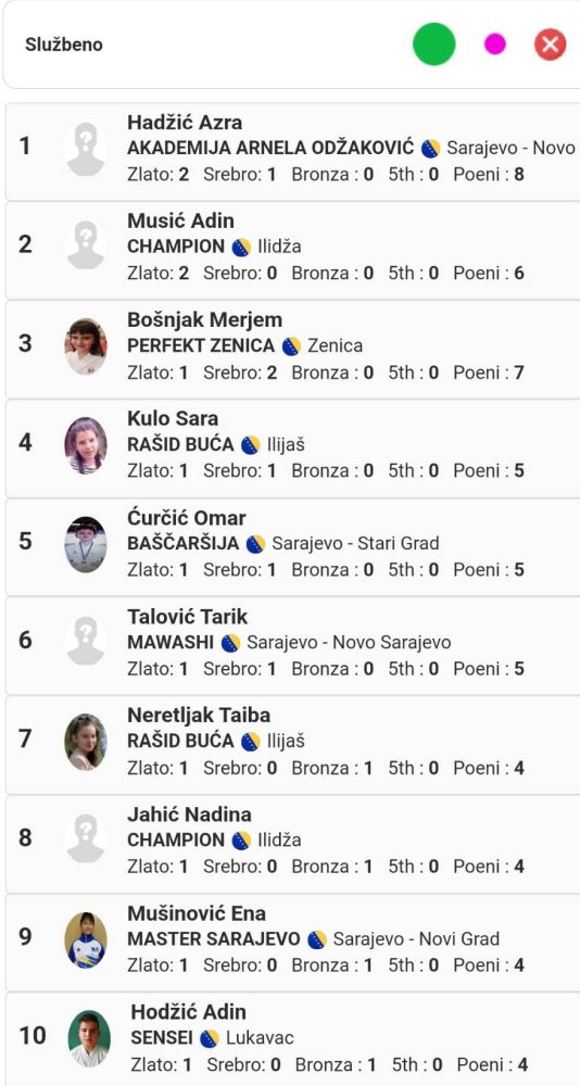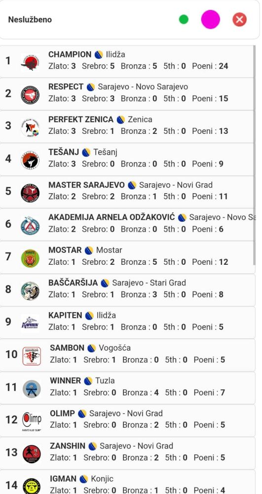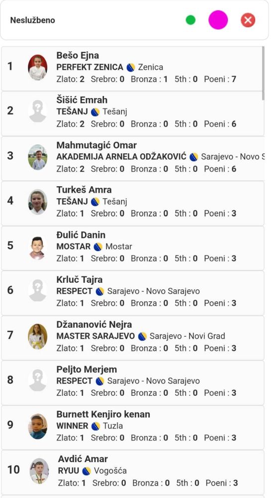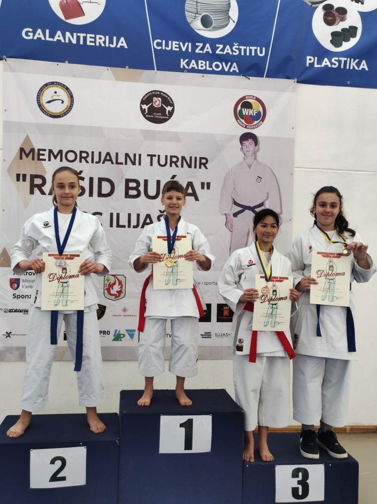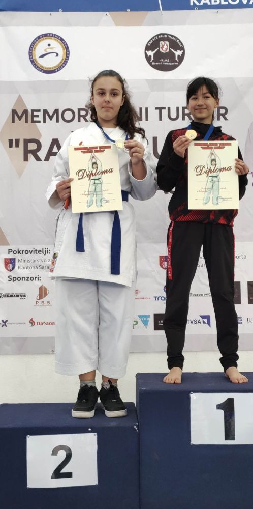 – Merjem Bošnjak prvo mjesto i zlatna medalja u borbama djevojčice 10 godina 40+kg, drugo mjesto i srebrena medalja u katama djevojčice 10 godina, drugo mjesto i srebrena medalja u borbama 11 godina 44+ +kg