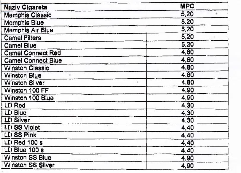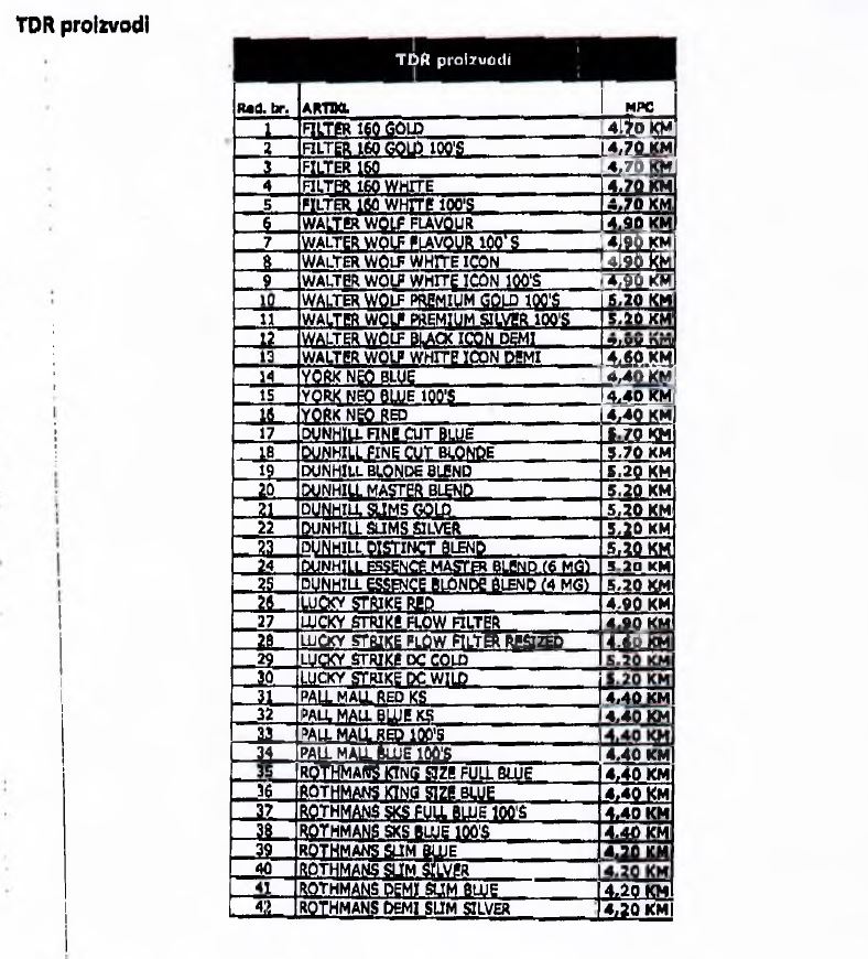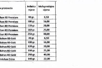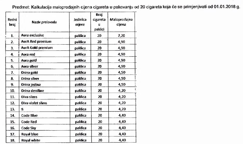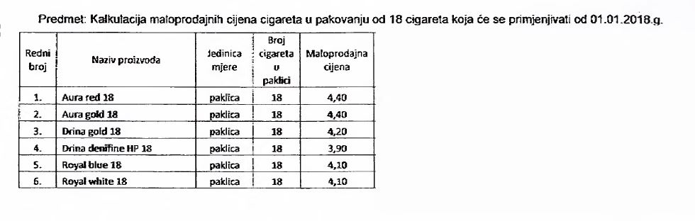 Proizvođači i distributeri cigareta bili su dužni da do 30.11.2017. godine u UIO dostave nove maloprodajne cijene cigareta koje će biti na snazi od početka 2018. godine, a koje su utvrđene u skladu s Odlukom o utvrđivanju posebne i minimalne akcize na cigarete i iznos akcize na duvan za pušenje za 2018. godinu, koju Odluku je donio Upravni odbor Uprave za indirektno oporezivanje.
