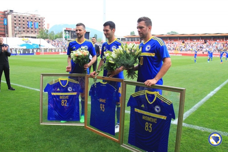U sastavu reprezentacije BiH od početka utakmice bili su Spahić, Misimović i Ibišević, koji su zamjenjeni nakon 17 minuta igre i onda svečano ispračeni ovacijama sa tribina Bilinog polja u reprezentativnu penziju. Poklone ispred NS/FS BiH uručio im je predsjednik Elvedin Begić. Poklon je uručila i reprezentacija Crne Gore. Najveće priznanje od Foruma građana Zenice, pozlaćeni “Medaljon Kulin ban”, dodjeljeno je Vedadu Ibiševiću, Zvjezdanu Misimoviću i Emiru Spahiću, za izuzetan doprinos u promociji i afirmaciji grada Zenice i Bosne i Hercegovine u svijetu.