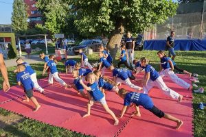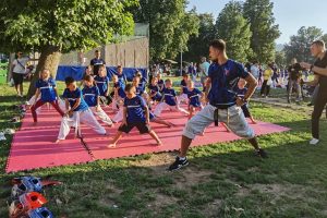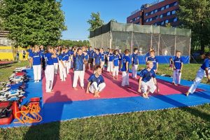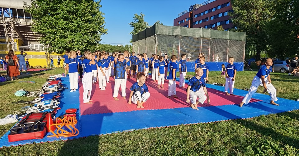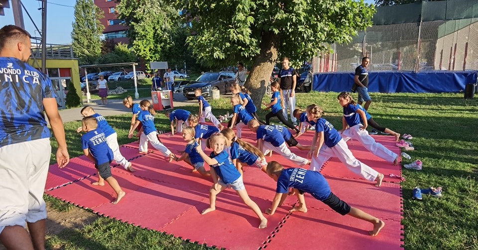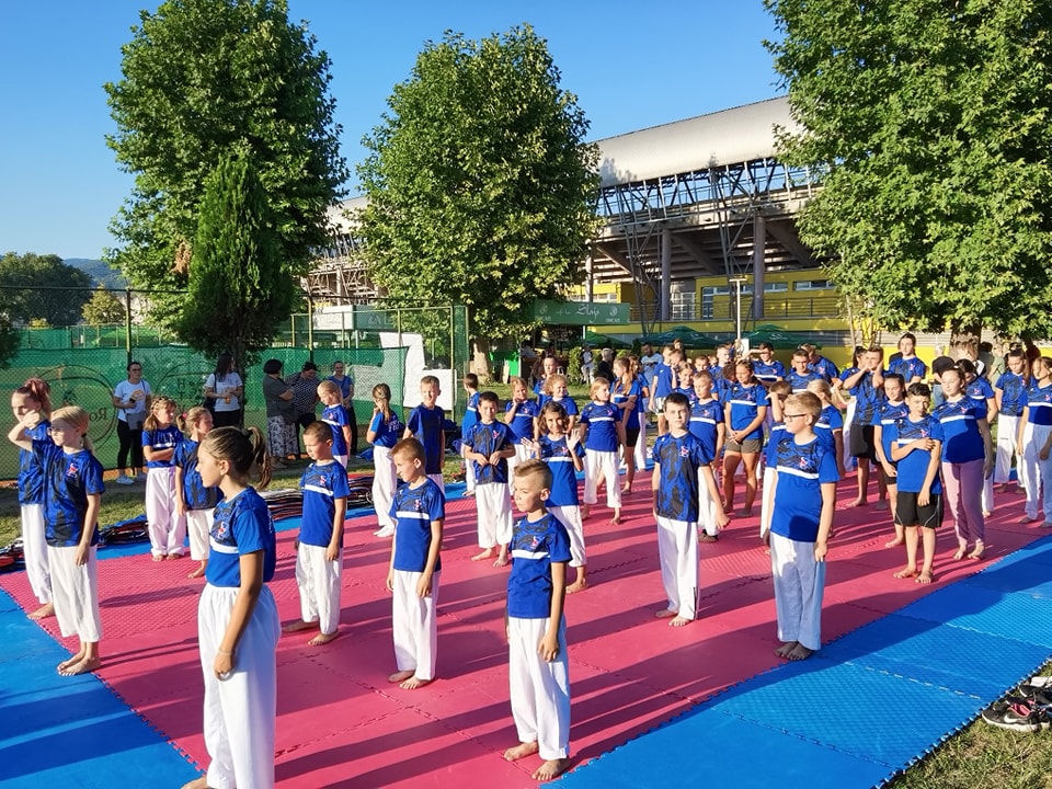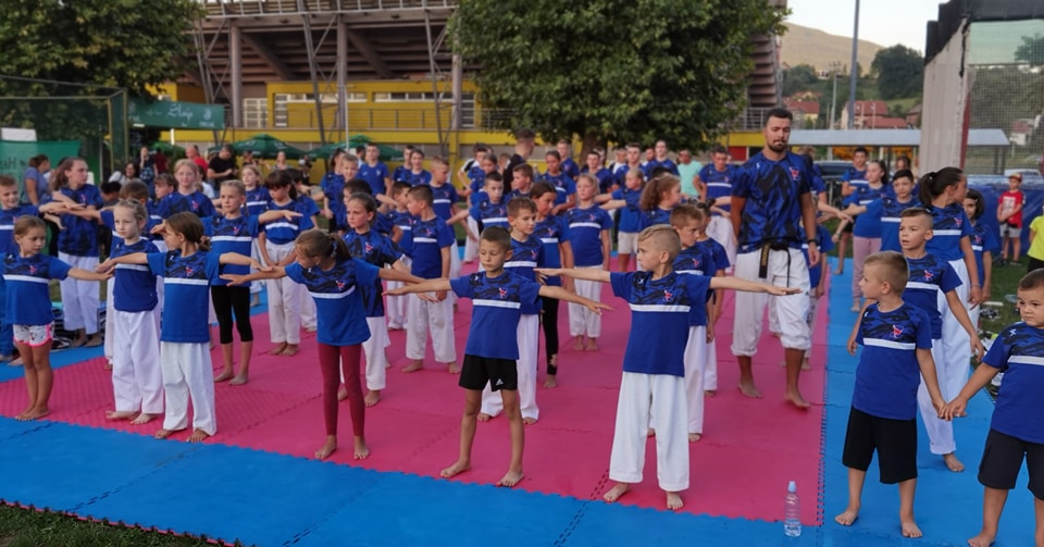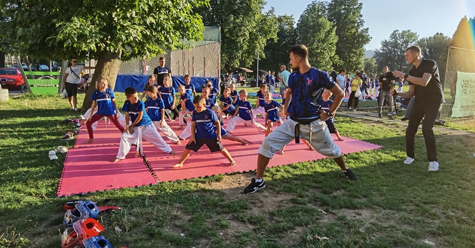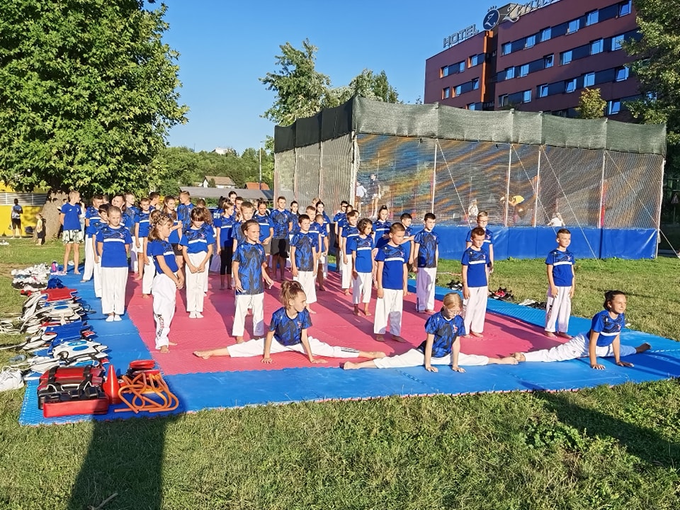 Trening je bio podijeljen u 2 grupe, na jednom borilištu su bili vrtićanci, a na drugom ostali te su bile obuhvaćene sve sfere jednog treninga ( zagrijavanje zglobova, trčanje, istezanje, tehnike na fokusere, borbene tehnike, borbe te na kraju lomljenje daski)