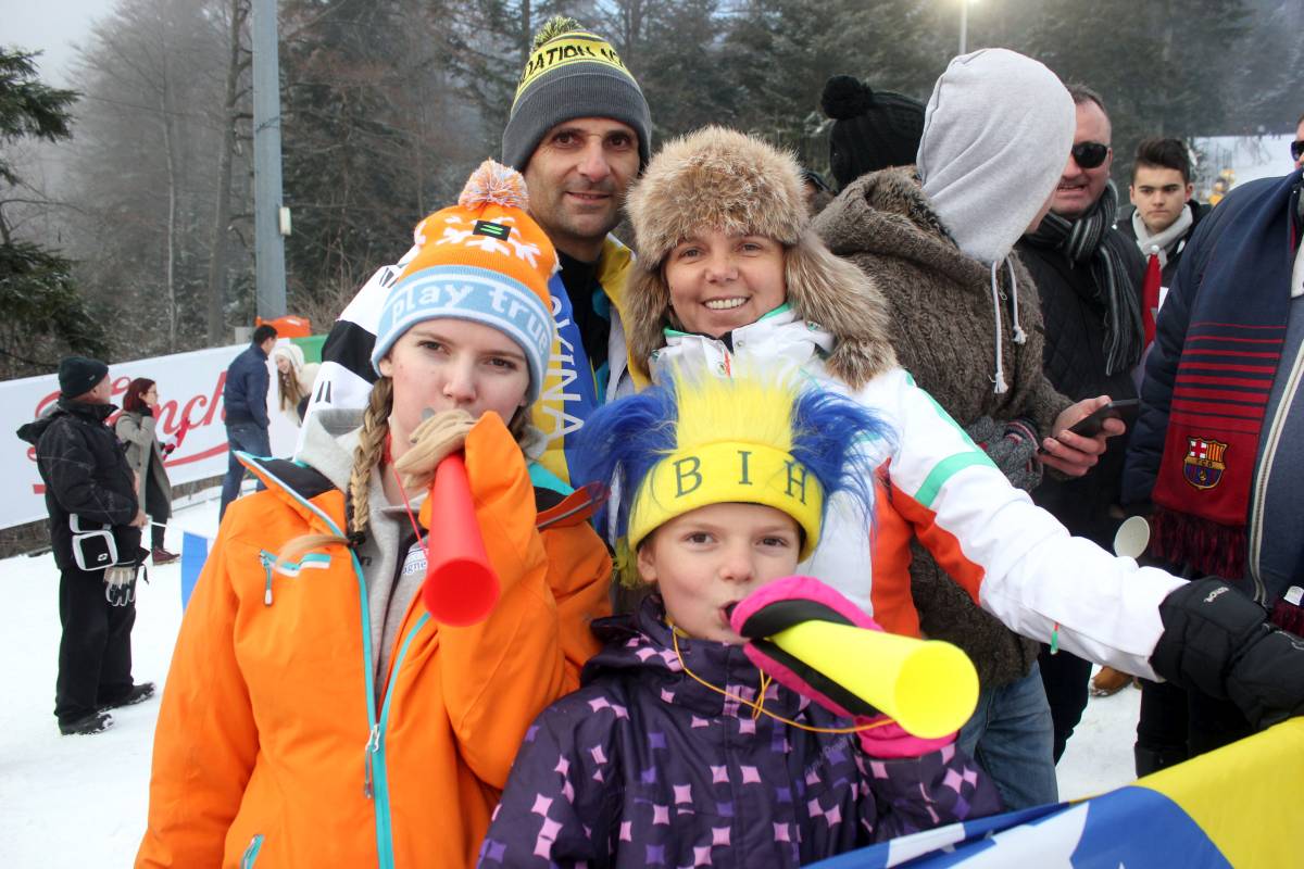 Uz sljemensku stazu sa bh. zastavama Elvedinu su došli bodriti otac Mihad, starija sestra Kanita, mlađa sestra Lamija i mama Harisa, a tu su s njima i amidža i amidžinica.