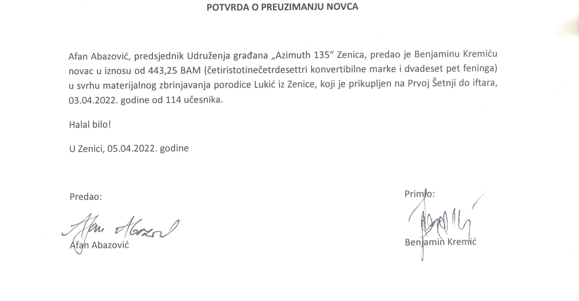 bilo je 0°C. Prikupili smo 443,25 BAM humanitarnog doprinosa, kojeg smo predali Benjaminu Kremiću, organizatoru humanitarne akcije za porodicu Lukić.